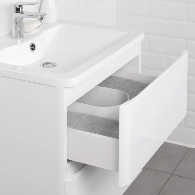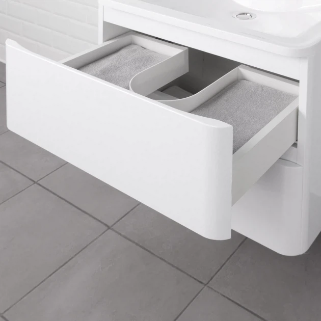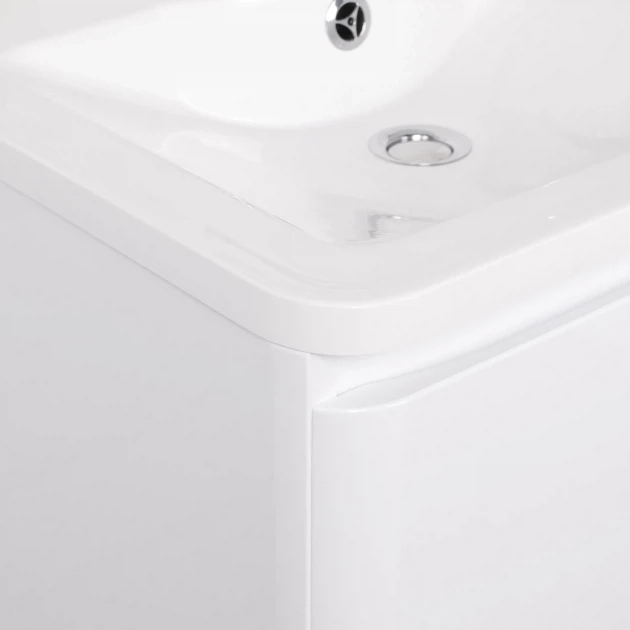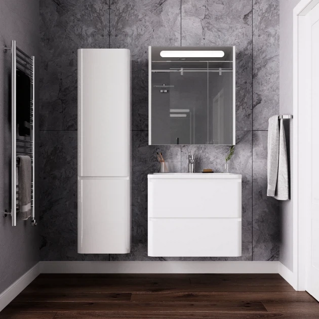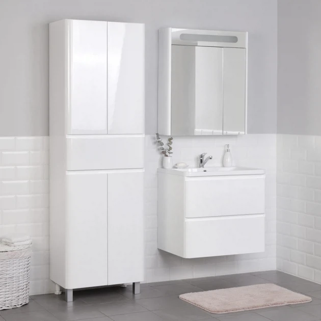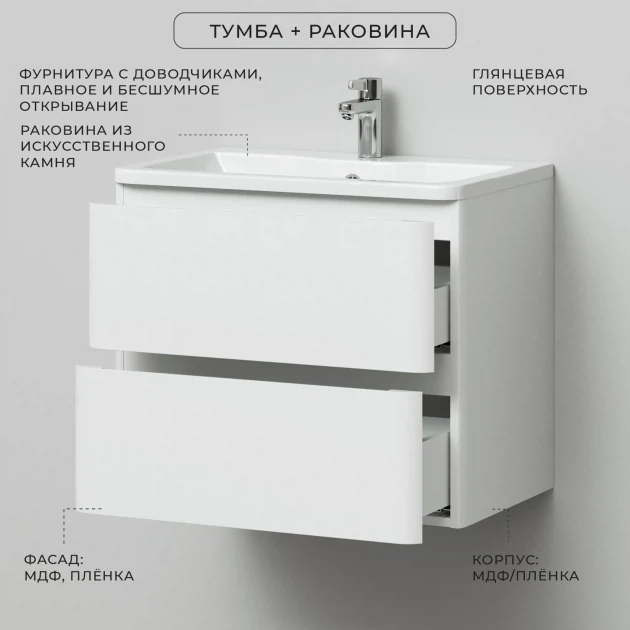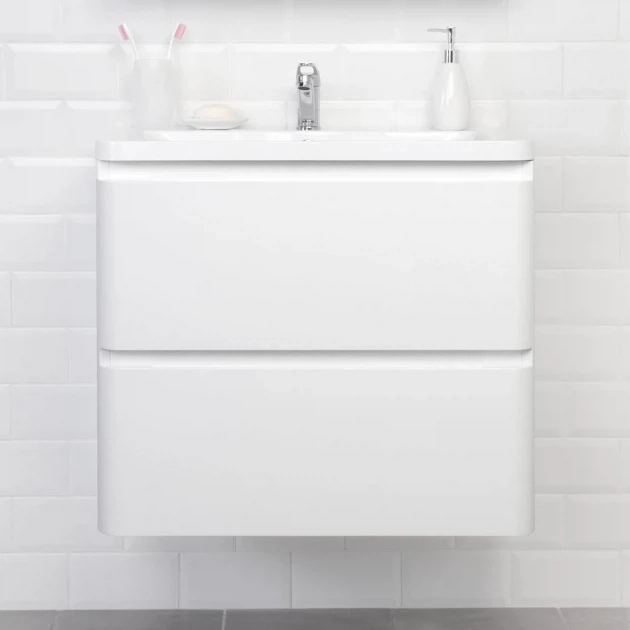 Невероятно органичная по дизайну коллекция Roberto великолепно смотрится в белом глянце. Эстетика изящества и минимализма-скругленные фасады, фрезерованные ручки, умывальник из литьевого мрамора, со скругленными углами. Подвесная тумба выполнена из влагозащищенного МДФ, покрытого белой глянцевой пленкой-ПВХ. Качественная фурнитура с доводчиками. Плавное и бесшумное закрывание ящиков. Универсальный пластиковый вырез под сифон. Умывальник из литьевого мрамора полностью закрывает корпус тумбы, что обеспечивает дополнительную защиту от воды. Подвесной способ установки дает возможность не только визуально увеличить пространство, но и обеспечивает быстрый и удобный доступ для уборки. Мебель способна вместить в себя достаточно много вещей. Изысканность, простота и гармоничность-все сошлось в этой прекрасной коллекции!