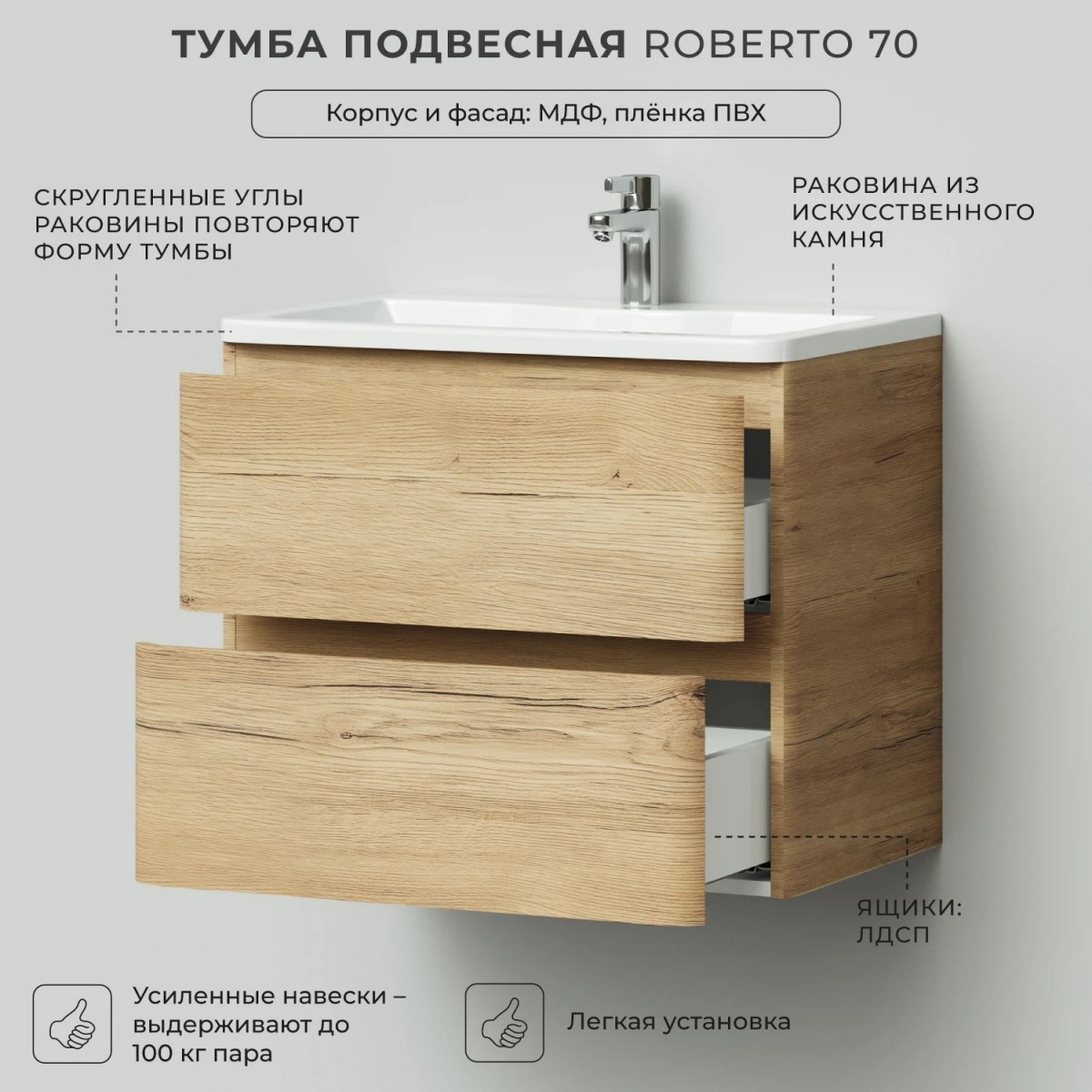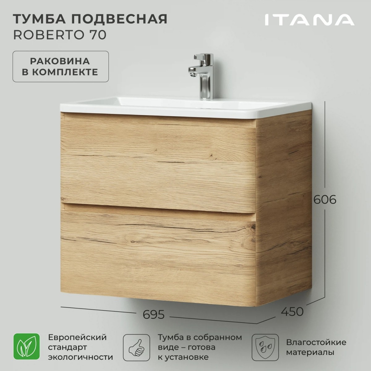 Тумба с раковиной Итана Roberto 4657826226563 70 см (дуб мавелла голд) подвесная