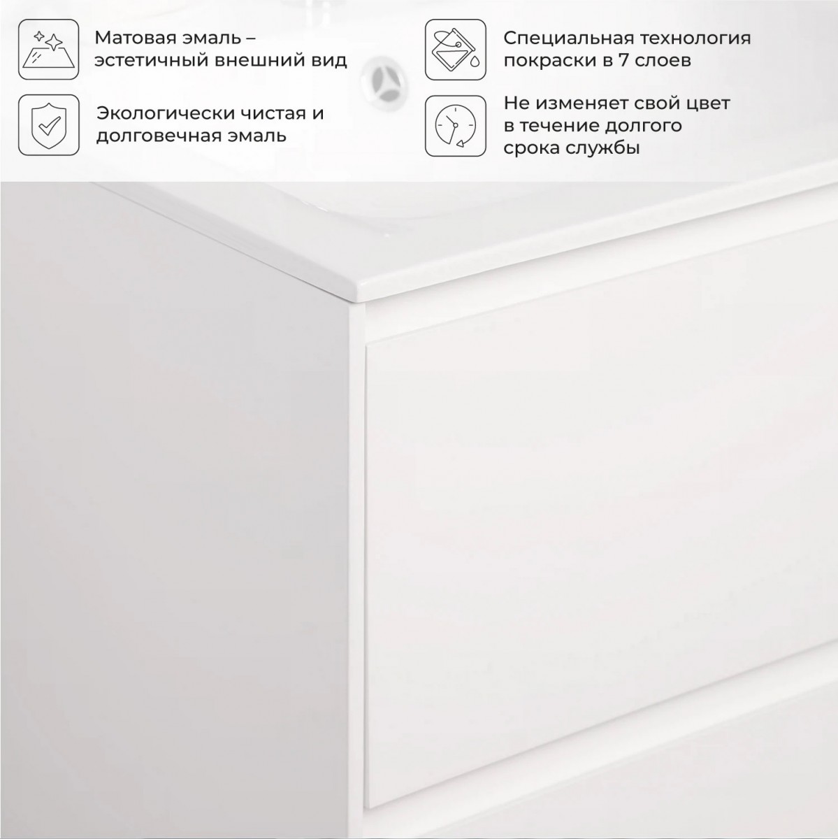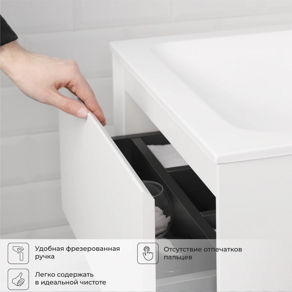 В коллекции Slim безупречно воплотилась простая геометрия мебели. Идеальные прямые линии, вкладные фасады, тонкая рамка корпуса, отсутствие лицевой фурнитуры – лаконичность, которая восхищает. Коллекция выполнена из влагозащищенного МДФ, покрытого матовой эмалью. Мебель прослужит долгие годы, не теряя своего идеального внешнего вида. Тумба укомплектована изящной белоснежной раковиной из искусственного камня простого дизайна. Комплект имеет подвесную систему крепления, что обеспечивает свободный доступ для поддержания чистоты в ванной комнате.