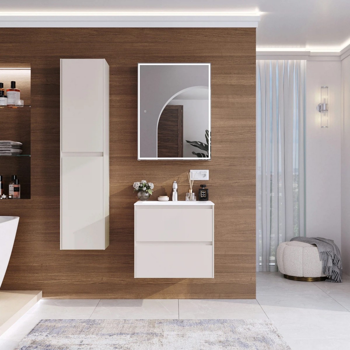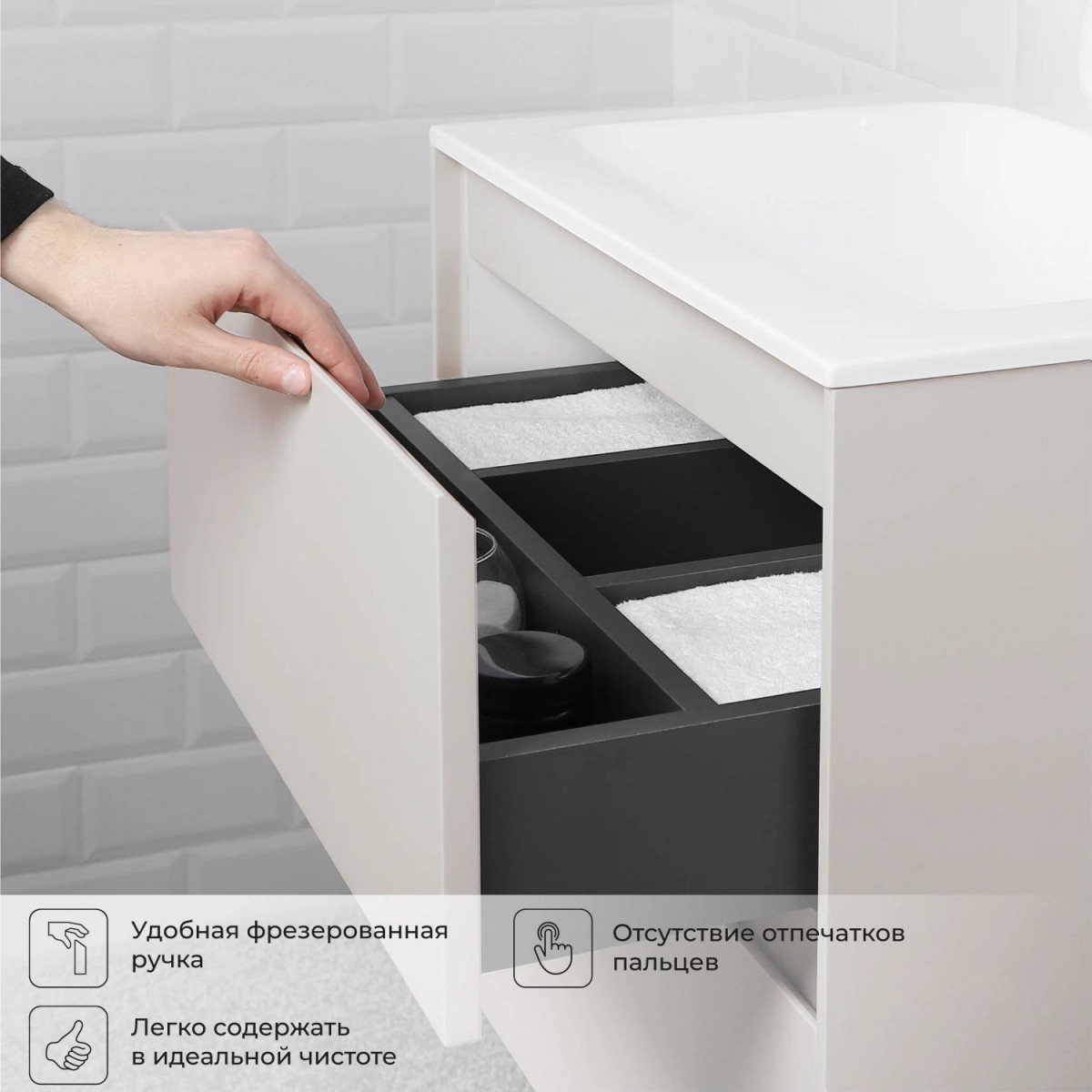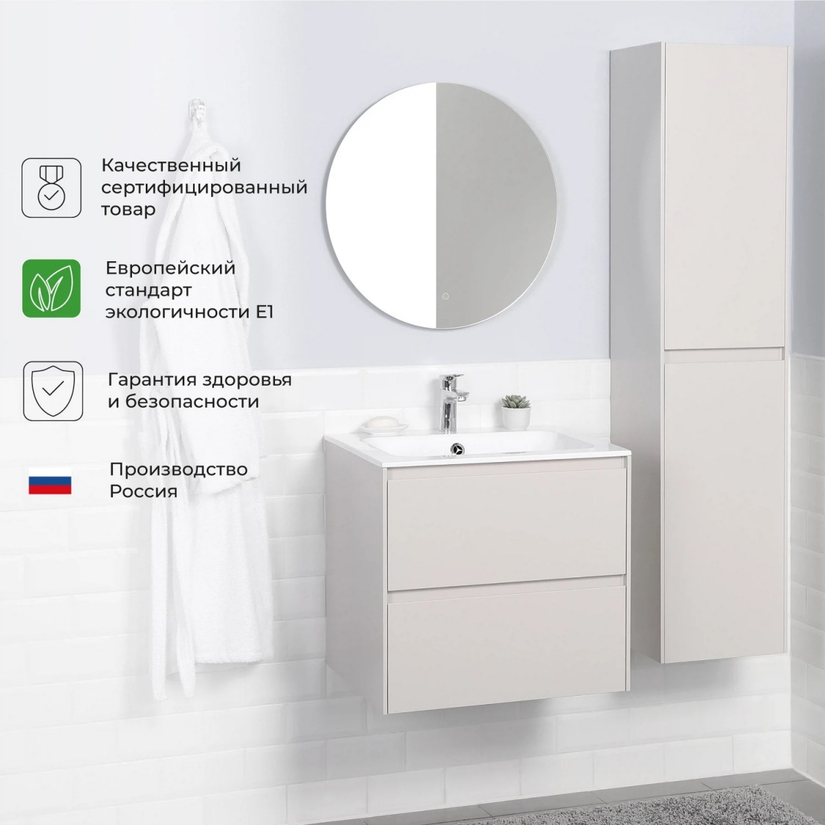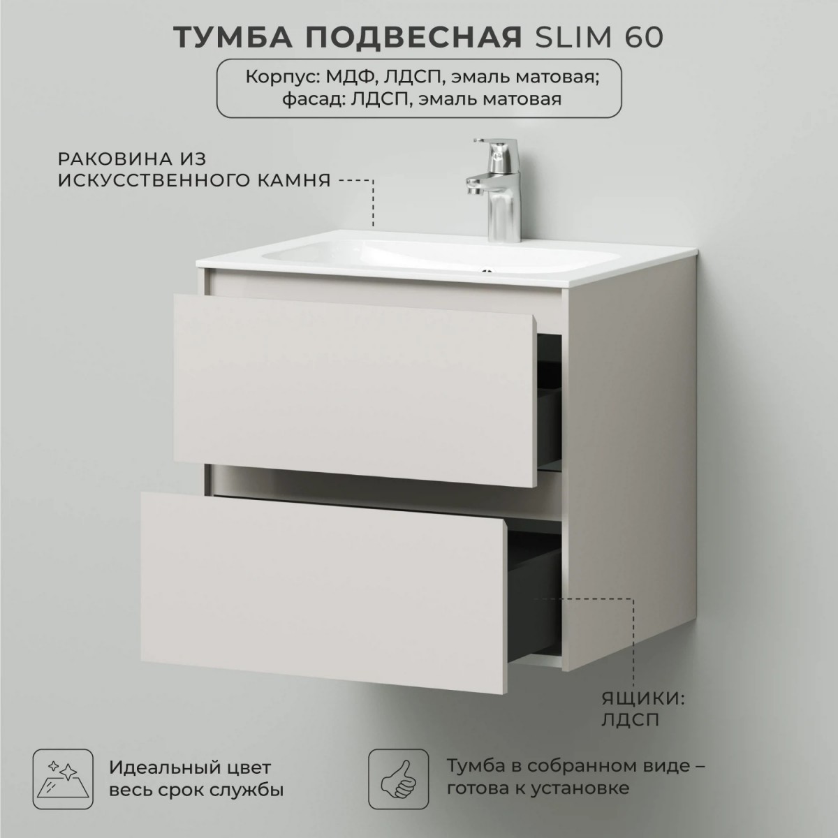В коллекции Slim безупречно воплотилась простая геометрия мебели. Идеальные прямые линии, вкладные фасады, тонкая рамка корпуса, отсутствие лицевой фурнитуры – лаконичность, которая восхищает. Коллекция выполнена из влагозащищенного МДФ, покрытого матовой эмалью. Мебель прослужит долгие годы, не теряя своего идеального внешнего вида. Тумба укомплектована изящной белоснежной раковиной из искусственного камня простого дизайна. Комплект имеет подвесную систему крепления, что обеспечивает свободный доступ для поддержания чистоты в ванной комнате.