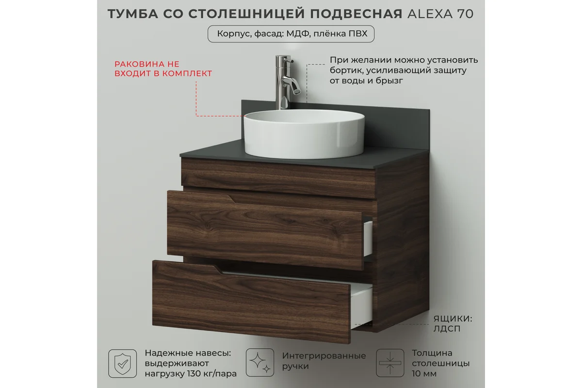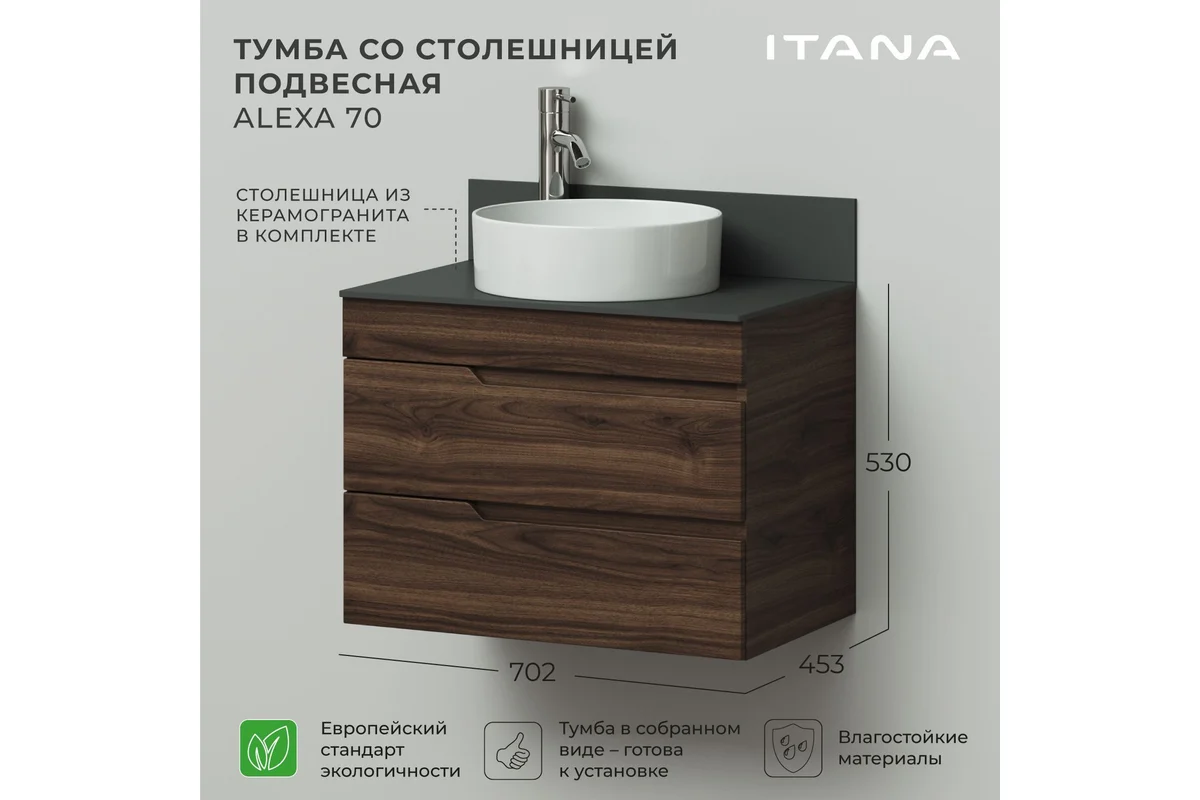 Тумба со столешницей Итана Alexa 4657834373204 70 см (орех пекан шоколад стронг) подвесная