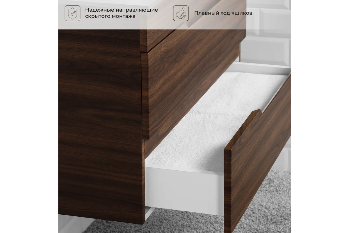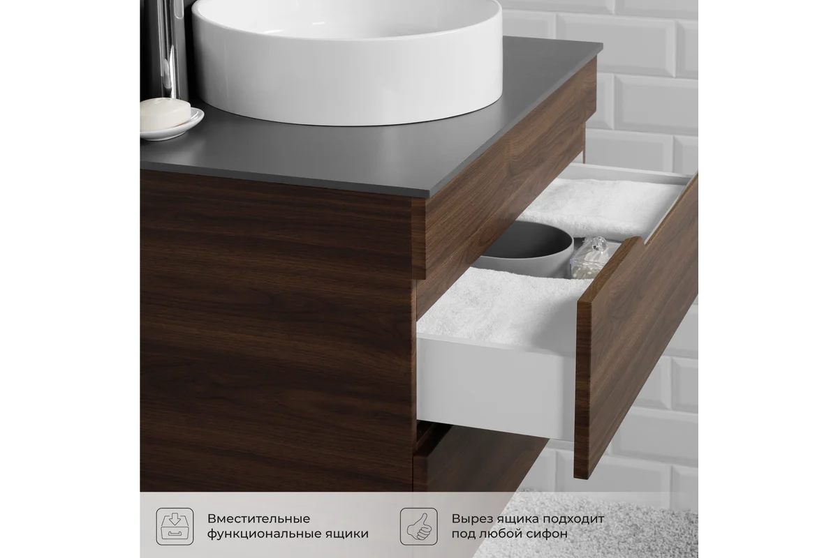 Откройте для себя идеальное решение для вашей ванной комнаты – тумбу со столешницей Итана Alexa 70. Этот элегантный предмет интерьера сочетает в себе современный дизайн и максимальную функциональность, что делает его незаменимым в любом санузле. Тумба для ванной Итана Alexa 70 имеет размеры 702х453х530 мм, что обеспечивает достаточное пространство для хранения ваших принадлежностей, при этом не занимая много места. Одним из главных преимуществ этой подвесной тумбы для ванной является ее универсальность. Тумба со столешницей встроена таким образом, что вся конструкция выглядит цельной и гармоничной, обеспечивая комфорт в использовании. Подвесной дизайн облегчает уборку пола под тумбой, позволяя вам поддерживать чистоту и порядок с минимальными усилиями. Встроенные современные механизмы открытия и закрытия ящиков обеспечивают плавное и бесшумное использование, что особенно важно в утренние часы или поздно вечером, чтобы не беспокоить домашних. Использованные материалы и качество сборки гарантируют долговечность и надежность тумбы со столешницей. Продуманная конструкция и изящные линии идеально впишутся в любую стилистику ванной комнаты, будь то классика или минимализм. Тумба со столешницей Итана Alexa 70 – это не просто мебельный атрибут, а важный элемент, который будет радовать вас ежедневно своим удобством и эстетичностью. Тумба со столешницей от ИТАНА разработана с учетом всех потребностей современного пользователя. Большие внутренние отделения позволяют удобно разместить все нужные предметы, будь то полотенца, косметика или бытовая химия. Это особенно полезно для небольших ванных комнат, где каждый сантиметр на счету. Пленка в цвете Орех Пекан шоколад стронг устойчива к влаге и температурным перепадам, что делает эту тумбу идеальным выбором для тех, кто ценит не только стиль, но и практичность. Для точного выбора тумбочки со столешницей в ванную комнату рекомендуем обратиться к схеме замеров, которая находится на фото в карточке товара, размеры изделия могут отличаться +/-1 см в связи со спецификой производства. Тумба для ванной доставляется в предварительно собранном виде, надежно упакована.