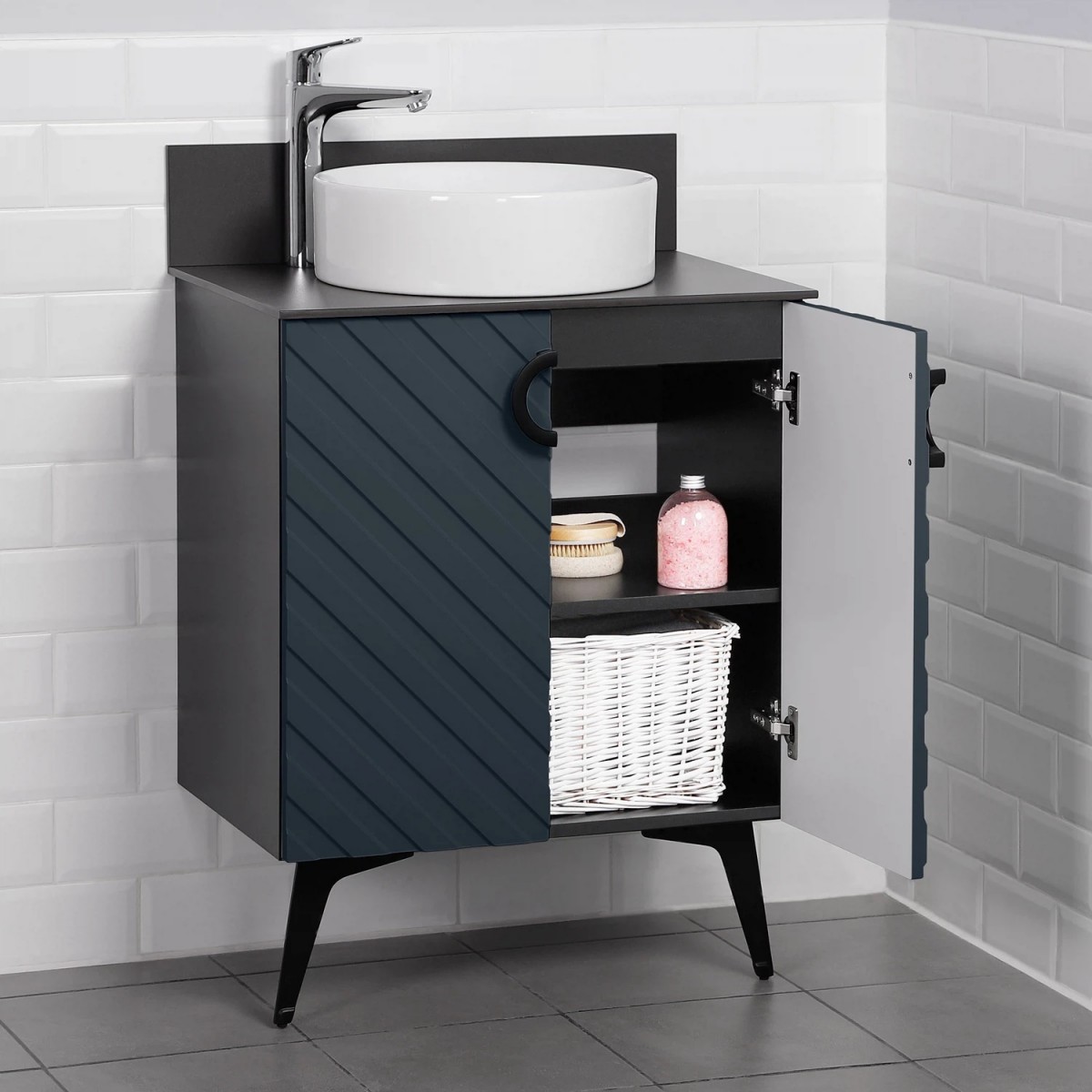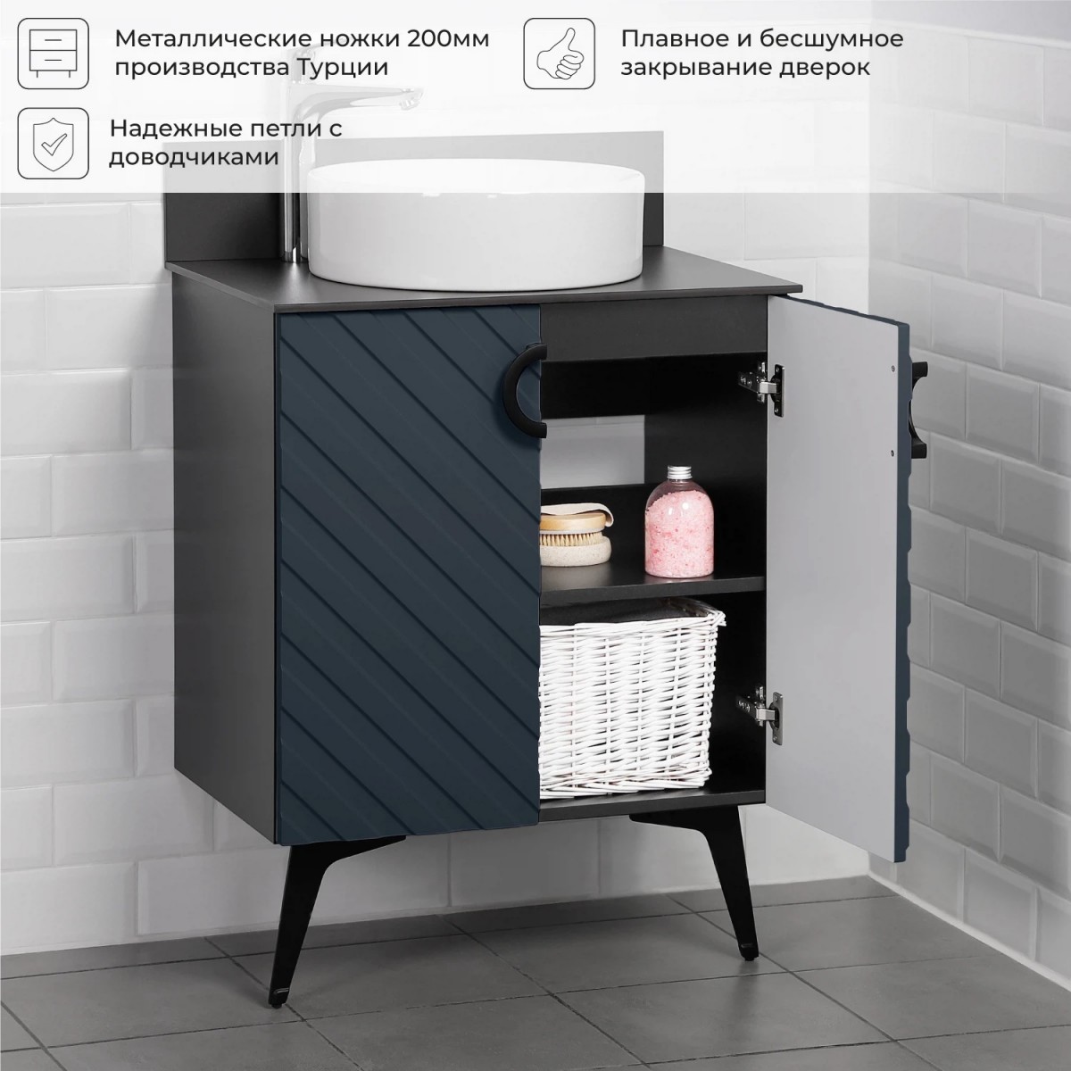 Коллекция Palladio - великолепное звучание современной классики. Изящные пропорции и нестандартный подход к дизайну с сохранением функциональности. Тумба со столешницей выполнена из ЛДСП в модных декорах. Технология производства позволила сделать элементы мебели устойчивыми к влаге. Качественная фурнитура с доводчиками обеспечивает легкое открывание и плавное закрывание дверей. Дизайнерские металлические ручки с покрытием - не только декоративный элемент, но и удобное решение - фасады остаются чистыми при постоянном открывании и закрывании. Вырез под сифон универсальный, для любого типа. Благодаря своей конструкции тумба обеспечивает удобный доступ к раковине и позволяет скрыть коммуникации. Тумба со столешницей в ванную оснащена удобным шкафчиком для хранения, что позволяет разместить всё необходимое под рукой. Для точного выбора тумбочки со столешницей в ванную комнату рекомендуем обратиться к схеме замеров, которая находится на фото в карточке товара, размеры изделия могут отличаться +/-1 см в связи со спецификой производства.
