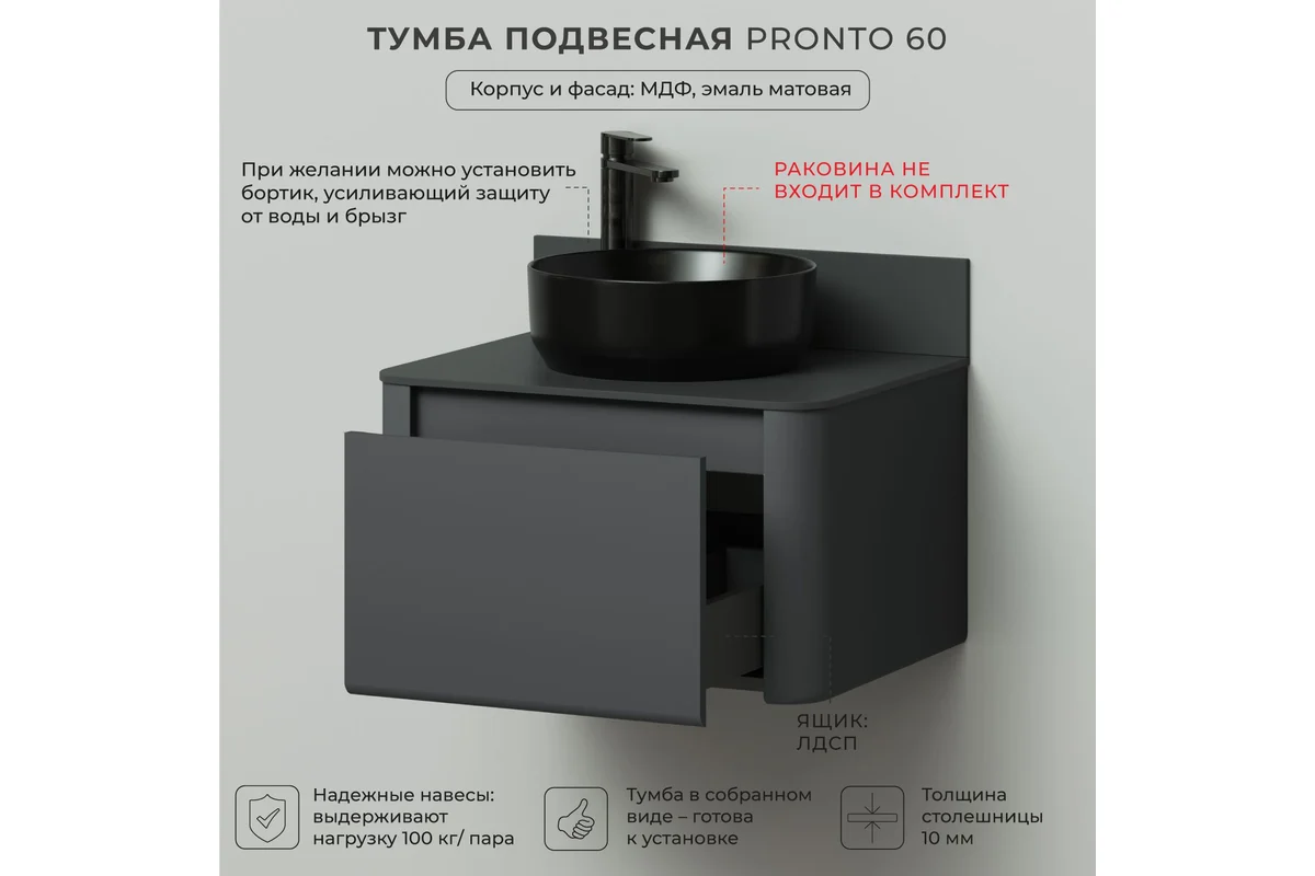 Тумба со столешницей Итана Pronto 4657810339910 60 см (эмаль графит матовый) подвесная