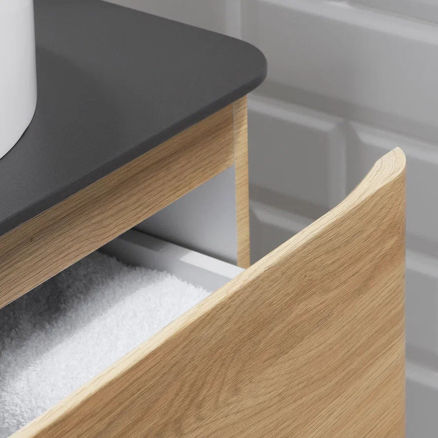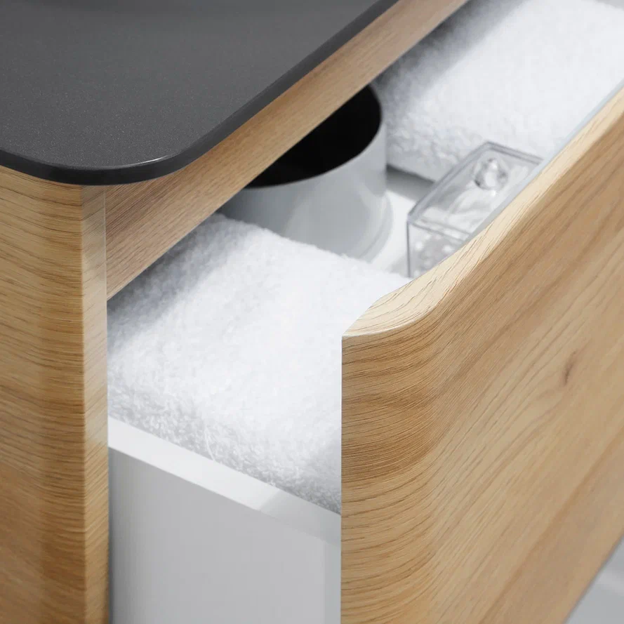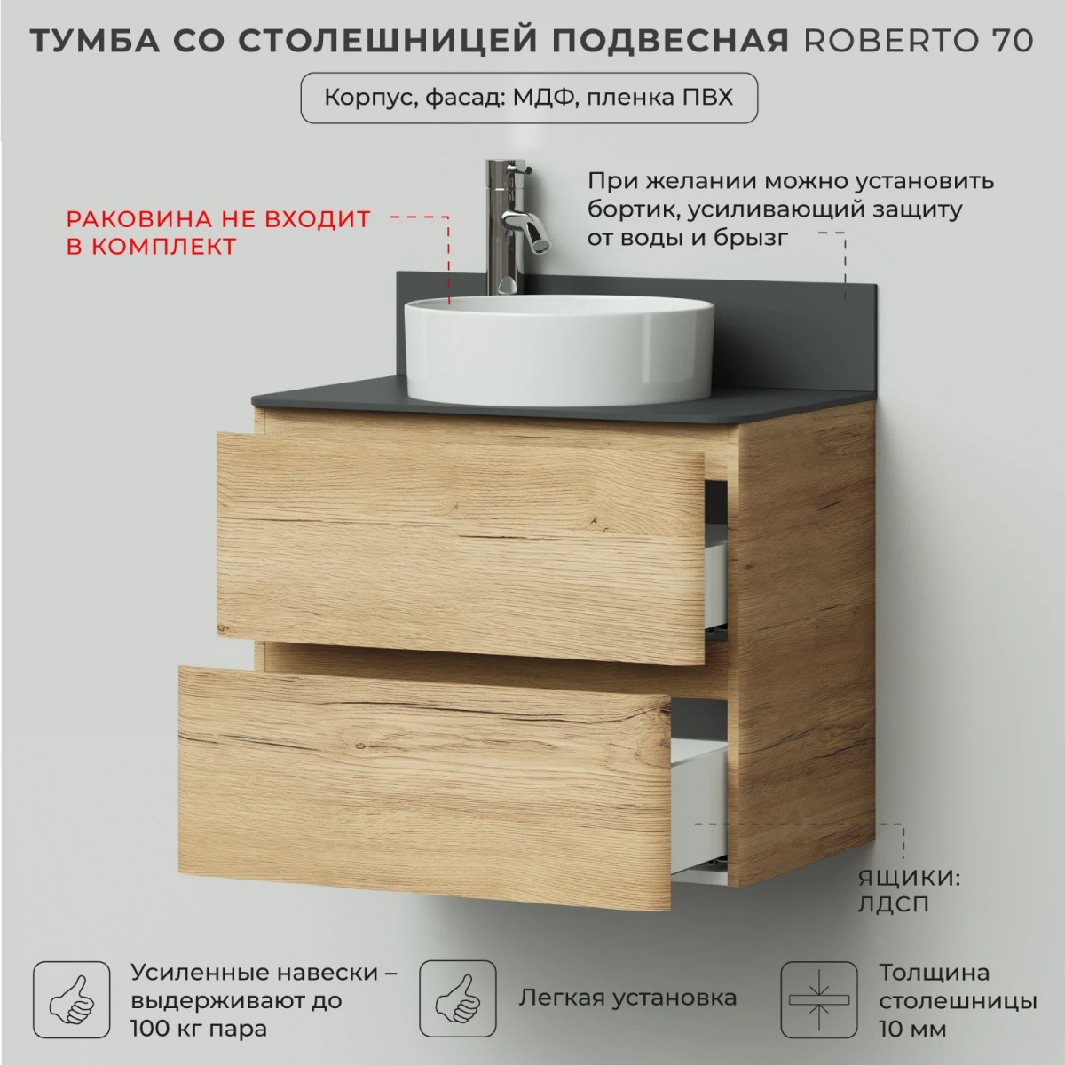 Подвесная тумба со столешницей из коллекции Roberto станет настоящим украшением вашей ванной комнаты. Тумба для ванны изготовлена из прочного МДФ, поэтому выдерживает высокие эксплуатационные нагрузки. Корпус и фасады тумбы для ванной покрыты матовой пленкой, что обеспечивает дополнительную защиту тумбы со столешницей от влаги и перепадов температуры. Качественная фурнитура с доводчиками обеспечивает легкое открывание и плавное закрывание ящиков и дверок. Вырез под сифон универсальный, для любого типа. Благодаря своей конструкции тумба позволяет скрыть коммуникации. Тумба со столешницей в ванную оснащена удобными ящиками для хранения, что позволяет разместить всё необходимое под рукой. Дополнить комплект можно пеналом и зеркалом. Для точного выбора тумбочки со столешницей в ванную комнату рекомендуем обратиться к схеме замеров, которая находится на фото в карточке товара, размеры изделия могут отличаться +/-1 см в связи со спецификой производства. Тумба для ванной доставляется в предварительно собранном виде, надежно упакована.