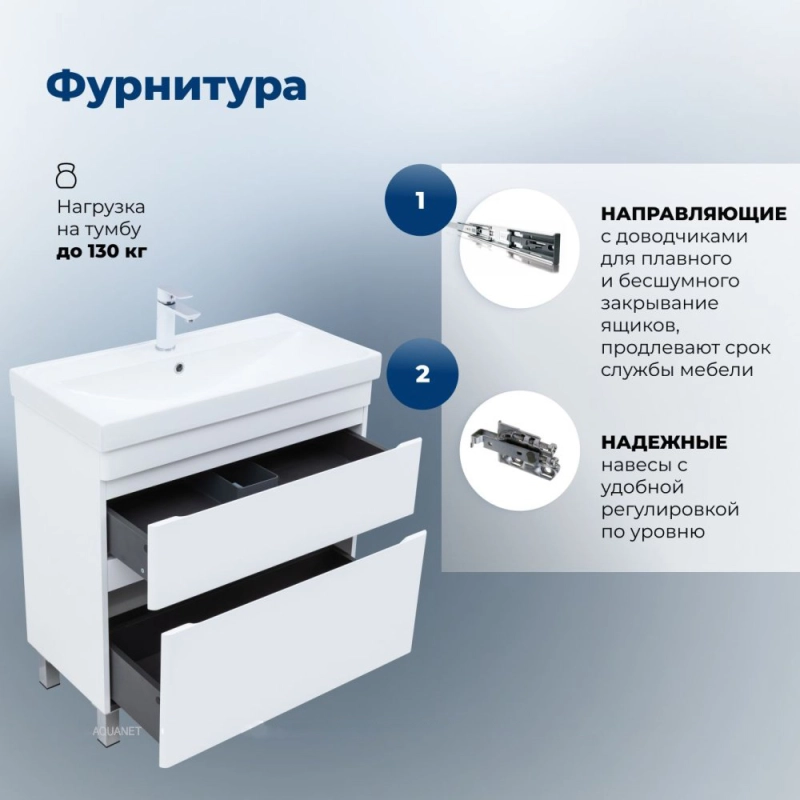 Тумба под раковину Aquanet Слим 80 напольная, белый сатин – компактное и функциональное решение для ванной комнаты. Она сочетает лаконичный дизайн и продуманные детали. Глубина тумбы с раковиной составляет 405 мм, что делает её удобной даже для небольших помещений.