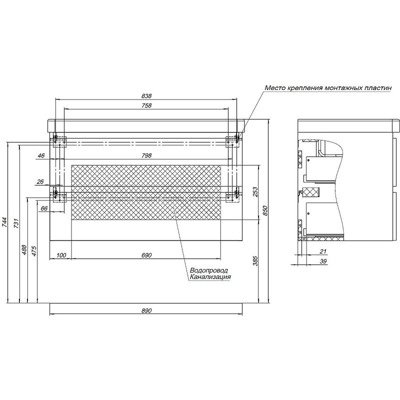 Габариты корпуса тумбы (ШxВxГ): 890х502х458 мм.