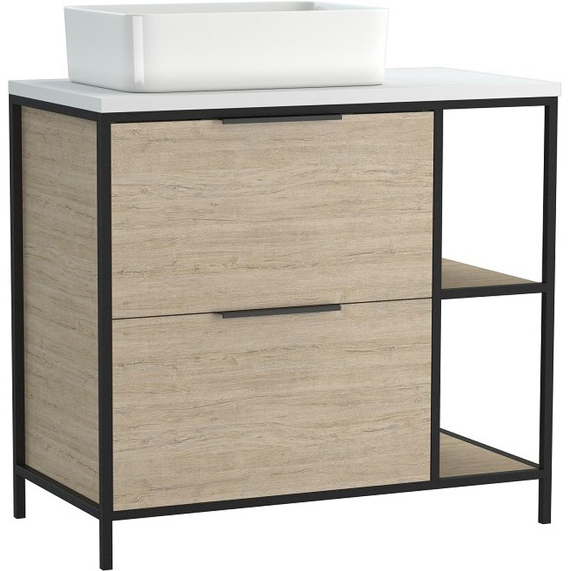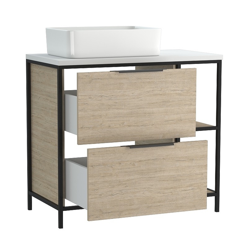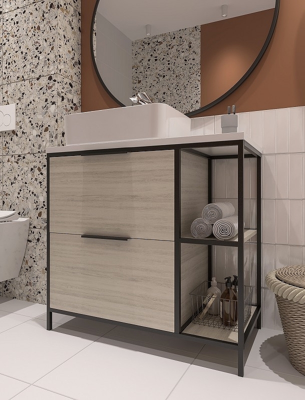 Тумба под раковину Cersanit Bosquet 80 63012 это гармоничное сочетание реалистичной имитации дуба со стальным каркасом, выполненным в строгом черном цвете. Белая глянцевая столешница, изготовленная из МДФ-плиты, выглядит как стекло и служит основанием для белоснежных раковин Cersanit из коллекций CREA. Стильная контрастная композиция прекрасно подходит для помещений с повышенной влажностью и перепадами температур — все детали конструкции тщательно защищены от воздействия воды и пара.