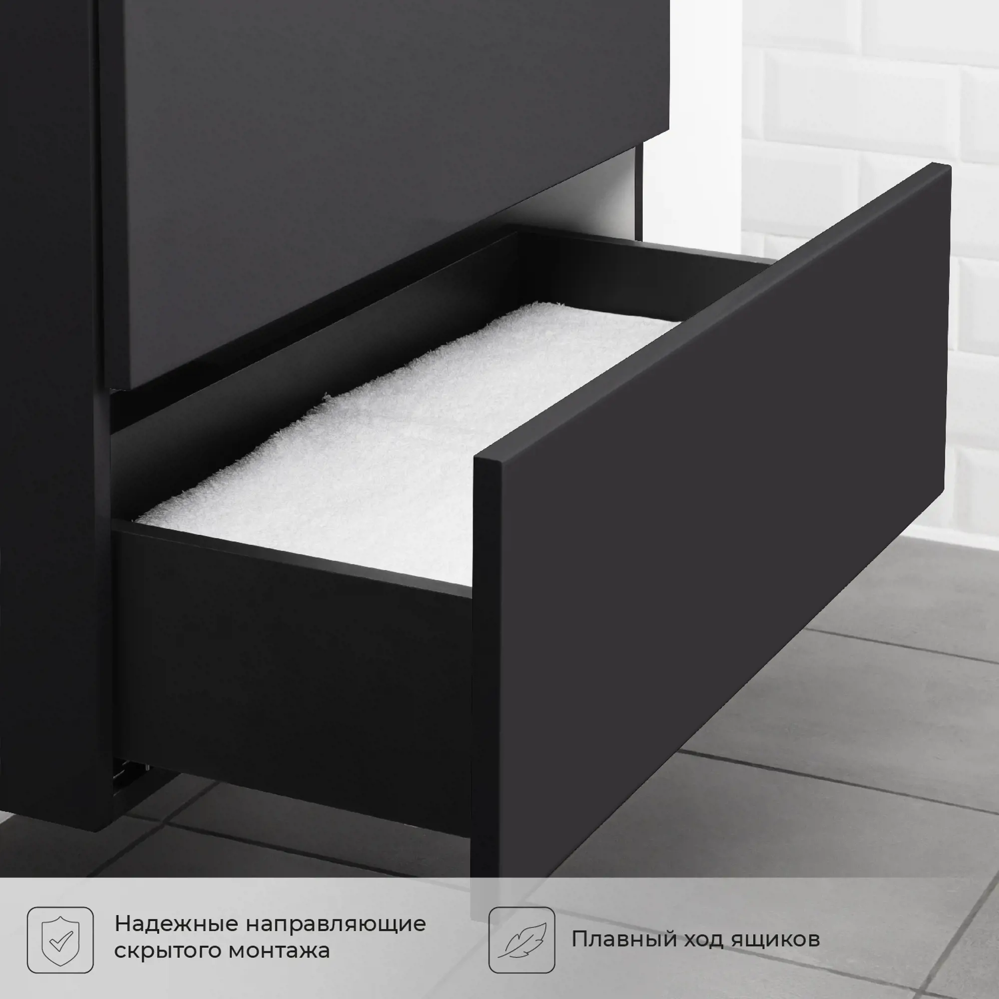 Мебель из коллекции Icon добавит ощущения чистоты и безупречности в современный интерьер ванной комнаты. Изделия выполнены из влагозащищенного МДФ, корпус и фасады покрыты ПВХ-пленкой. Система push-to-open позволяет открывать выдвижные ящики простым нажатием на фасад. Качественные направляющие скрытого монтажа обеспечат плавное открывание и закрывание ящичка. То есть, при небольшом надавливании, ящик — немного выдвинется наружу. Главное преимущество системы: отсутствие ручек на фасадах. Подвесной способ установки обеспечивает легкую уборку в ванной комнате. Идеальные прямые линии, лаконичность, которая восхищает. Такая мебель удовлетворит потребности покупателей в функциональности, но не будет забирать все внимание на себя.