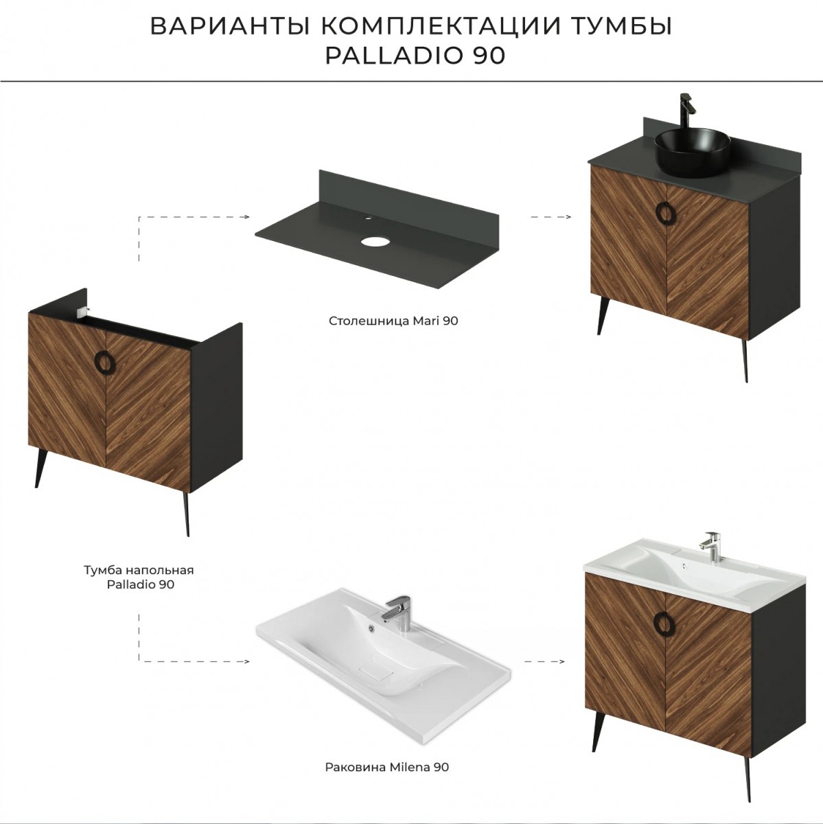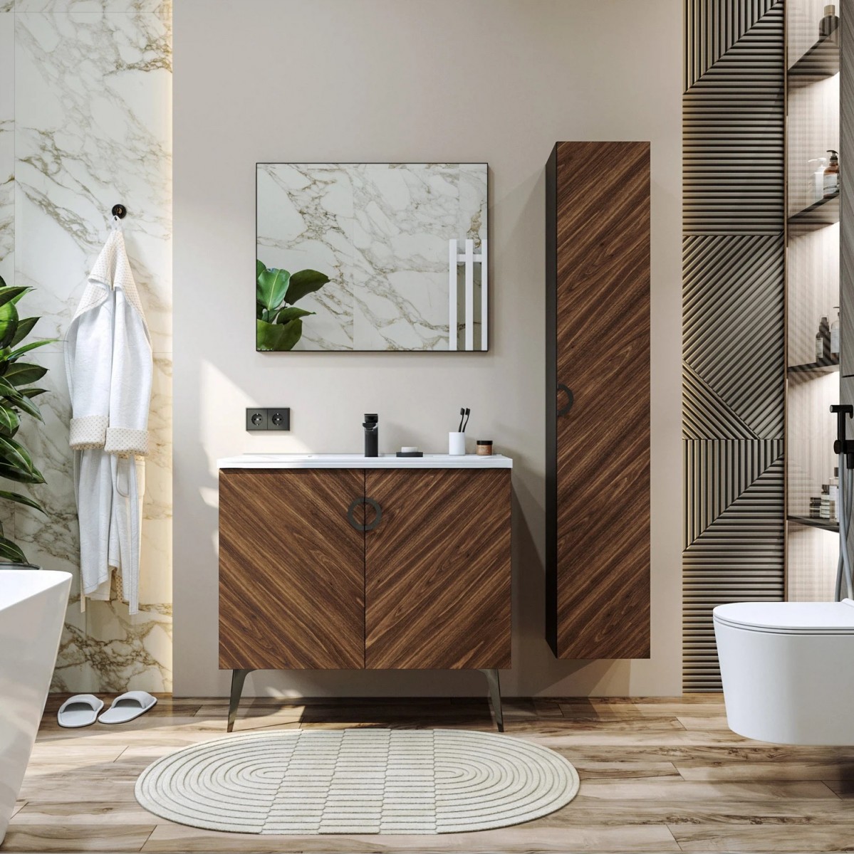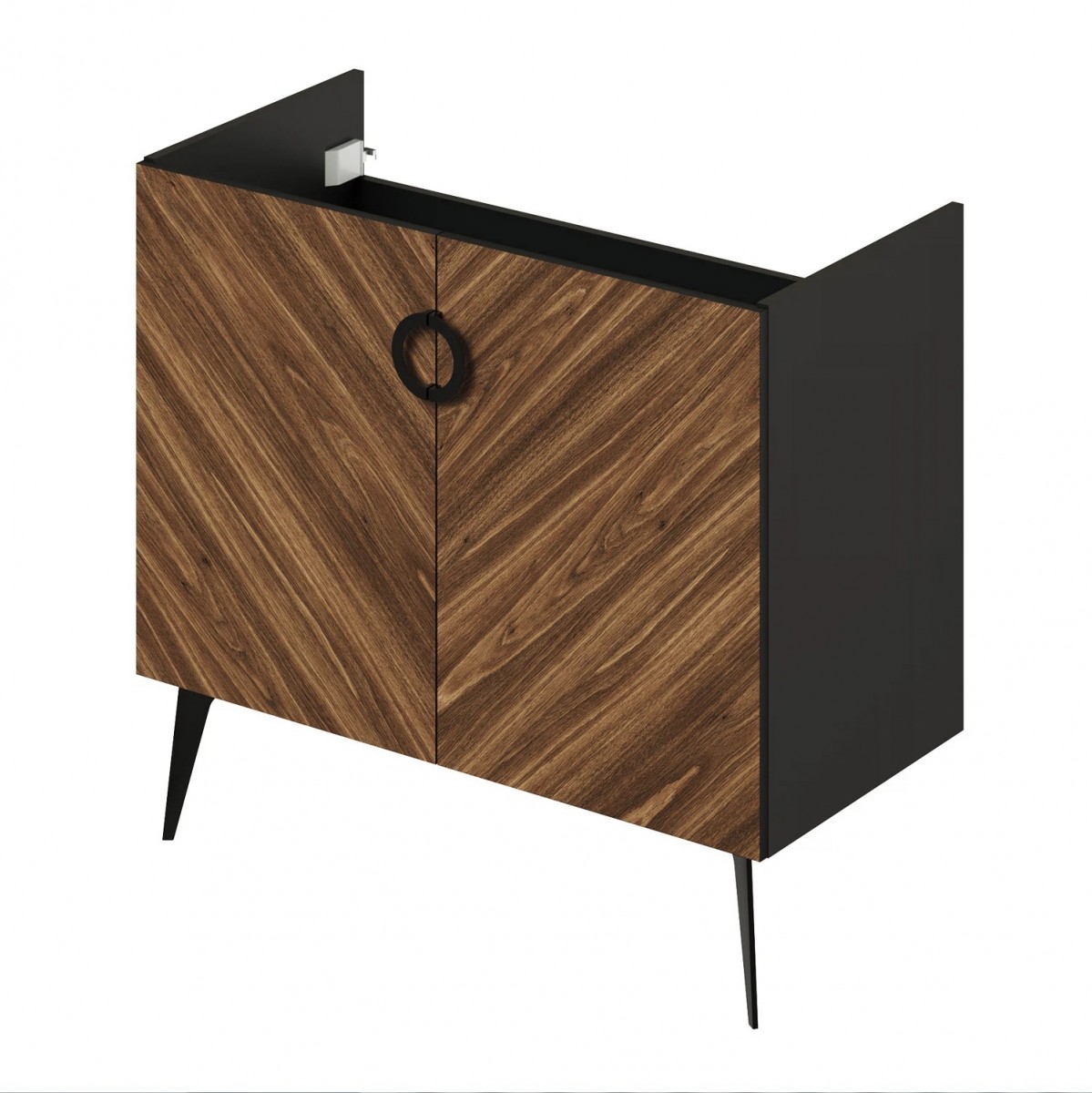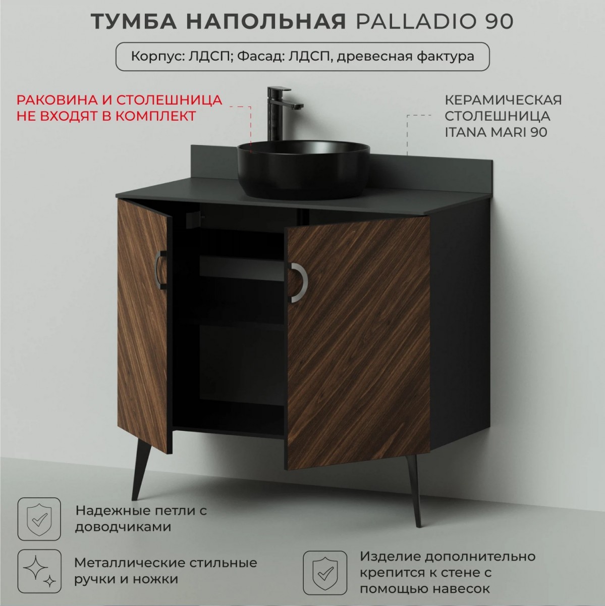 Коллекция Palladio - великолепное звучание современной классики. Изящные пропорции и нестандартный подход к дизайну с сохранением функциональности. Тумба для ванной выполнена из ЛДСП в модных деревянных декорах. Технология производства позволила сделать элементы мебели устойчивыми к влаге. Качественная фурнитура с доводчиками обеспечивает легкое открывание и плавное закрывание дверей. Дизайнерские металлические ручки с покрытием - не только декоративный элемент, но и удобное решение - фасады остаются чистыми при постоянном открывании и закрывании.