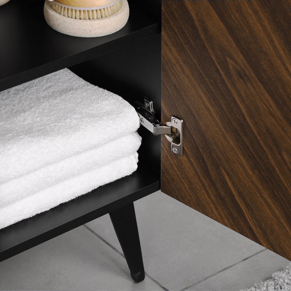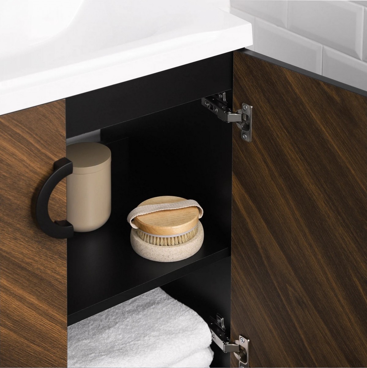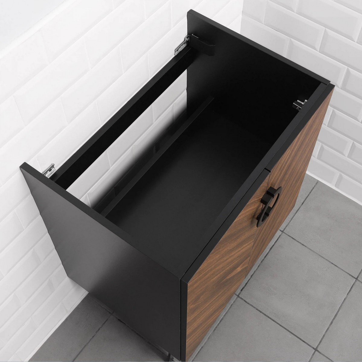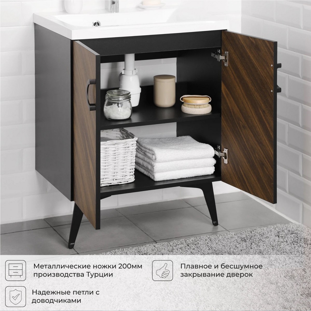 Коллекция Palladio - великолепное звучание современной классики. Изящные пропорции и нестандартный подход к дизайну с сохранением функциональности. Тумба для ванной выполнена из ЛДСП в модных деревянных декорах. Технология производства позволила сделать элементы мебели устойчивыми к влаге. Качественная фурнитура с доводчиками обеспечивает легкое открывание и плавное закрывание дверей. Дизайнерские металлические ручки с покрытием - не только декоративный элемент, но и удобное решение - фасады остаются чистыми при постоянном открывании и закрывании.