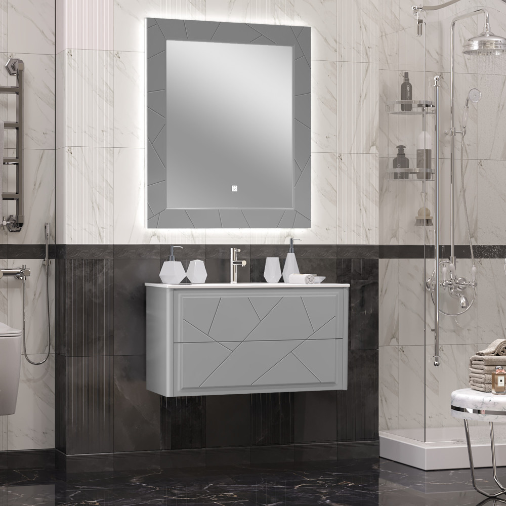 Коллекцию ЛУИДЖИ украшают сложная фрезеровка фасадов строгими линиями и декоративная подсветка по периметру зеркала, которое оснащено сенсорным выключателем. Тумбы дополняются современными ультратонкими керамическими раковинами в размерах 70,80,90,100 см. Коллекция ЛУИДЖИ по праву заслуживает называться хитом продаж, благодаря своему универсальному дизайну и профессиональному исполнению. Внимание к деталям и качество покраски выделяет ЛУИДЖИ среди другой мебели для ванной комнаты. Коллекция ЛУИДЖИ имеет универсальную тумбу в размере 90 см и может комплектоваться прочной столешницей из керамогранита, на которую устанавливается накладная раковина любого дизайна и производителя. Коллекция изготавливается в цветах белый матовый и серый матовый. Мебель оснащена механизмами плавного закрывания Hettich (Германия).