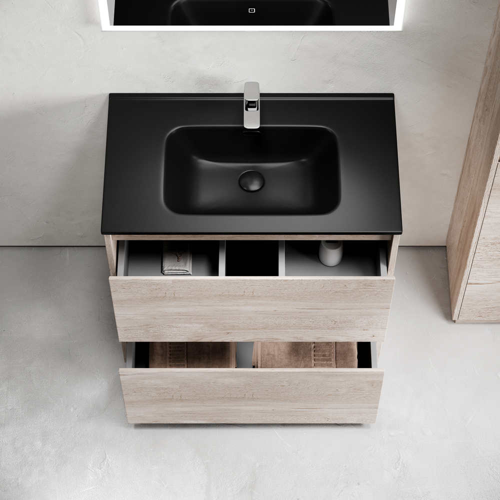 Тумба напольная Libra c двумя ящиками с доводчиками скрытого монтажа, с системой плавного закрывания и с ручкой по всей длине ящика. Каркас и фасад тумбы выполнен из ЛДСП в цвете «дуб галифакс натуральный». Покрытие - ламинат. Основание тумбы имеет ножки c регулировкой высоты до10 мм для компенсации возможной неровности напольного покрытия. Внутреннее пространство тумбы выполнено из надежного ЛДСП серого цвета. Размер 790х450х840, артикул LB80FEG.
