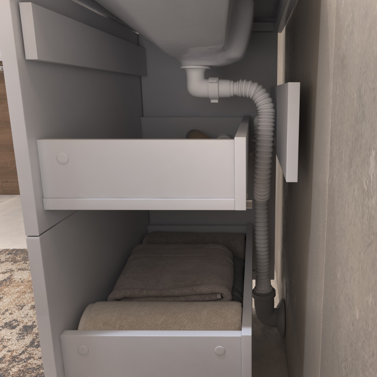 Оснащение: 2 выдвижных ящика, направляющие скрытого монтажа, 2 навеса, 2 опоры квадратные регулируемые, 1 сифон