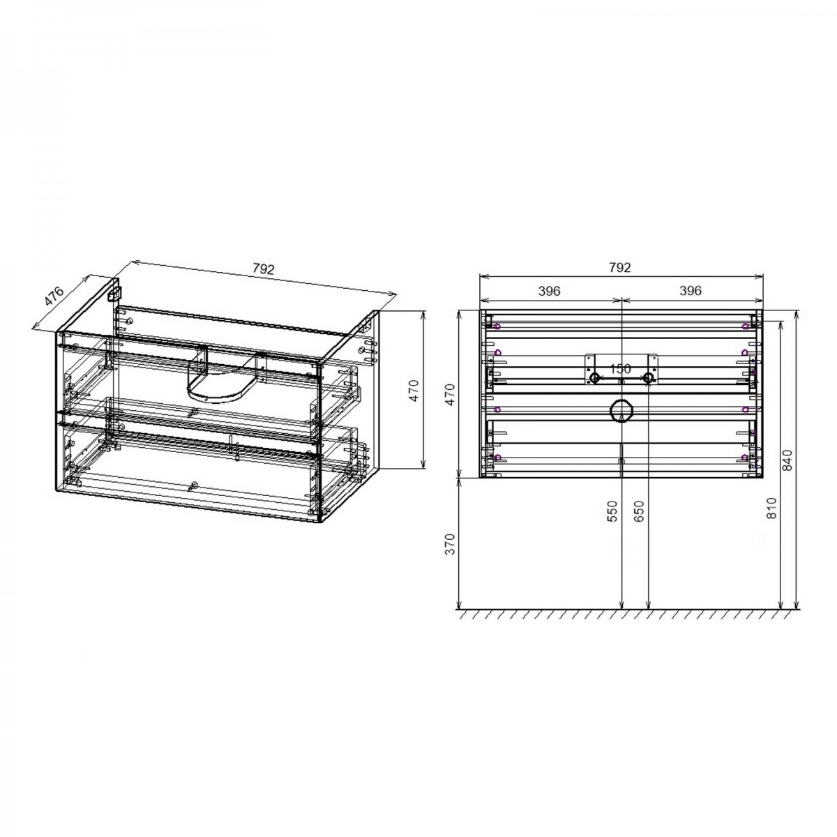 - Система хранения: 2 выкатных ящика soft close