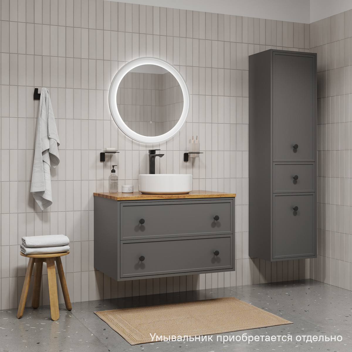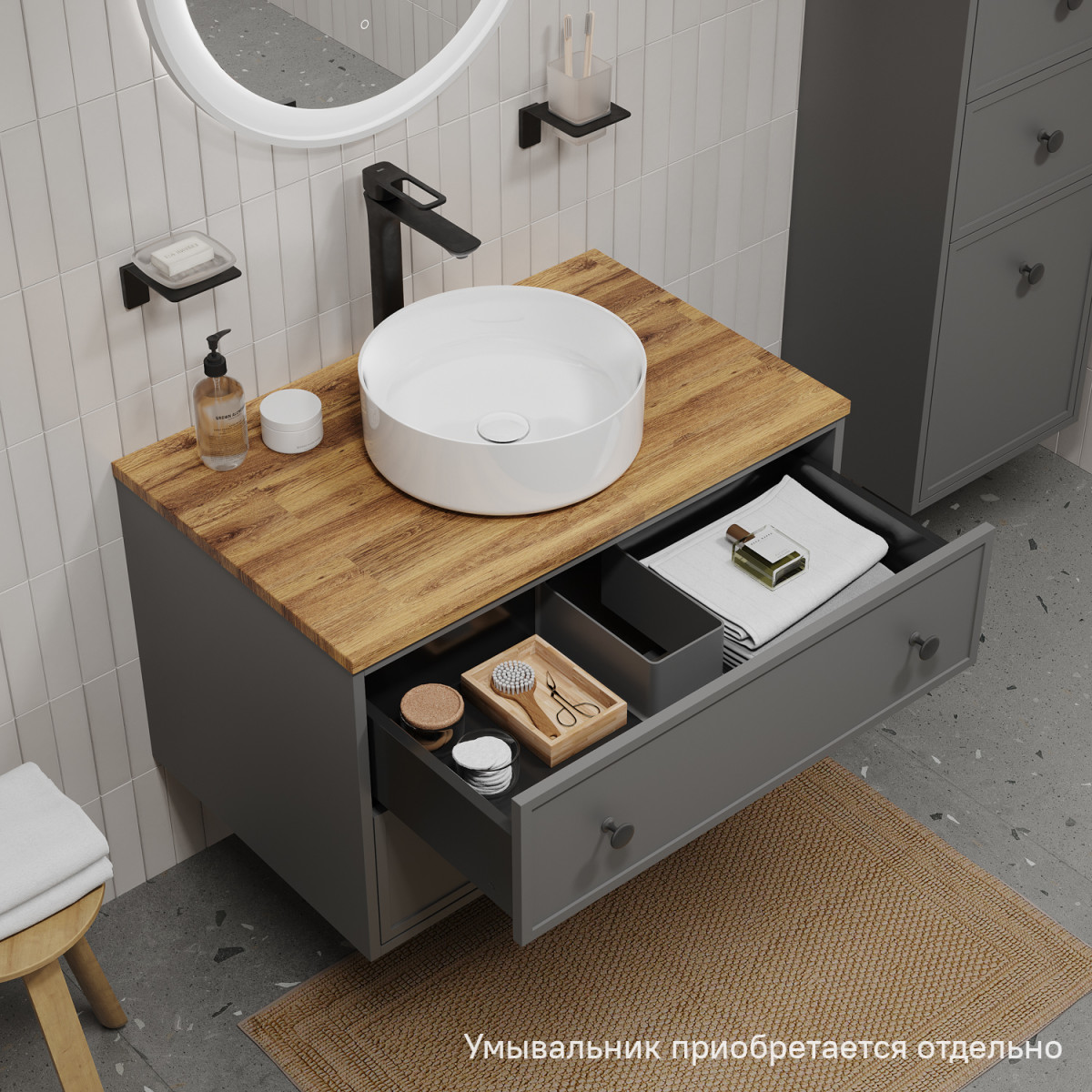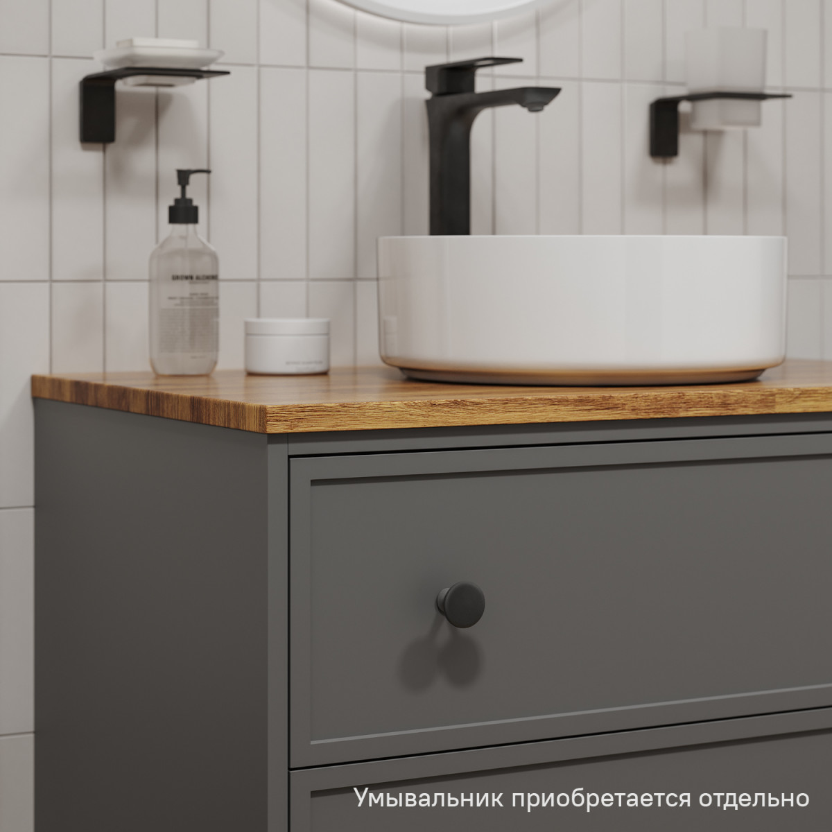 Длина изделия, мм: 480 Уникальные преимущества: Чёрные матовые ручки, накладной умывальник, ящики с механизмом плавного доведения Ширина изделия, мм: 762 Высота изделия, мм: 501 Размер изделия, мм.: 762*480*501 Цвет изделия: Темно-серый