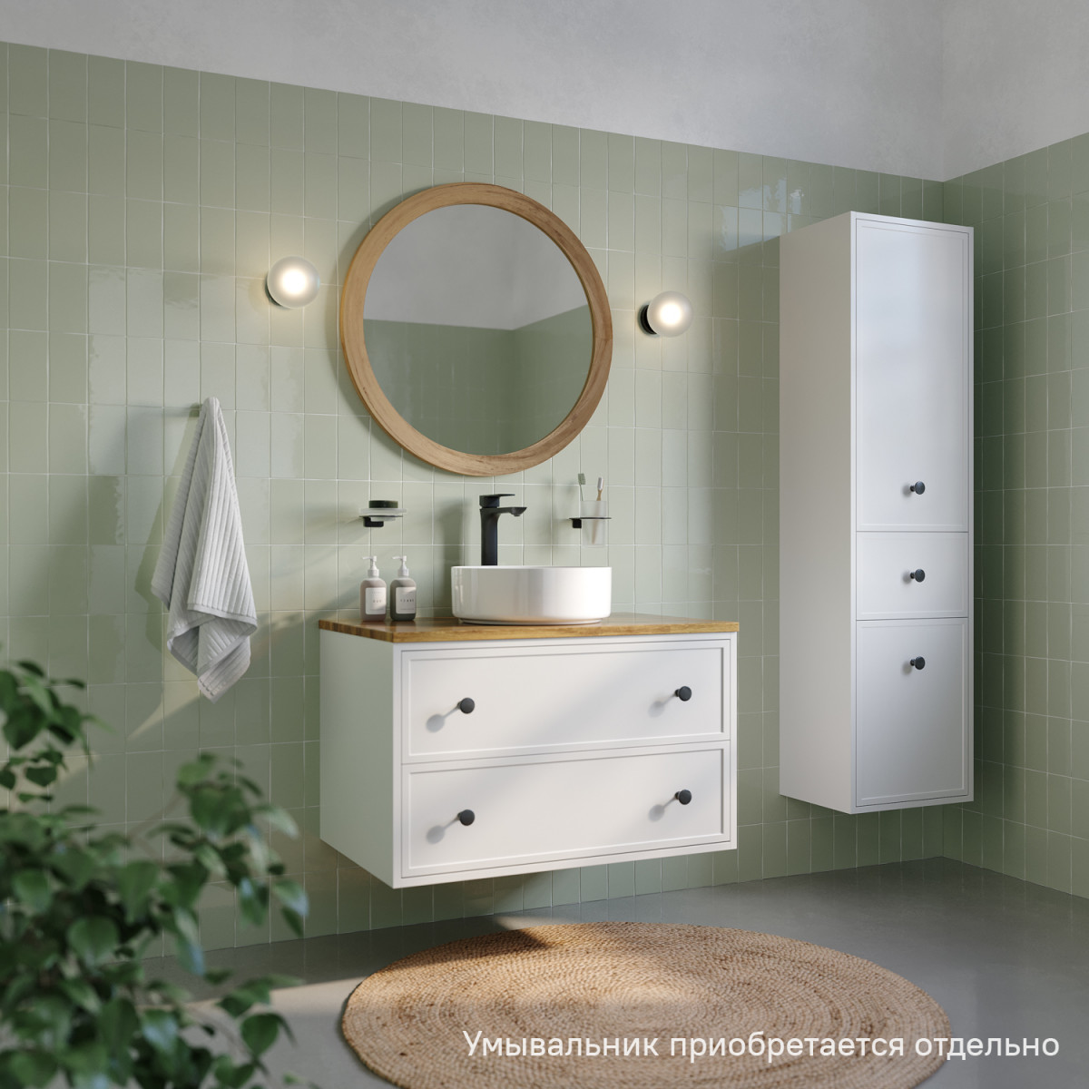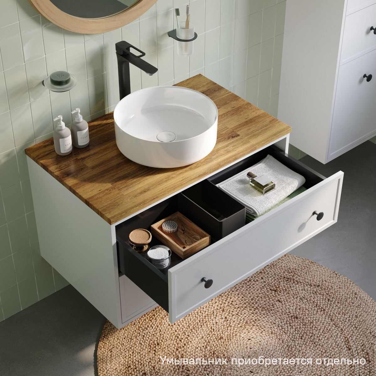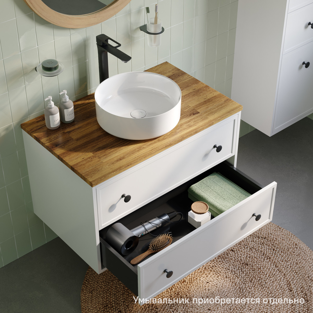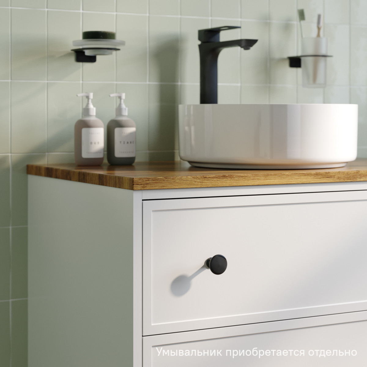 Длина изделия, мм: 480 Уникальные преимущества: Чёрные матовые ручки, накладной умывальник, ящики с механизмом плавного доведения Ширина изделия, мм: 762 Высота изделия, мм: 501 Размер изделия, мм.: 762*480*501 Цвет изделия: Белый матовый