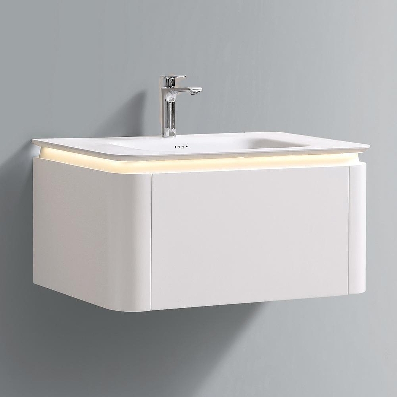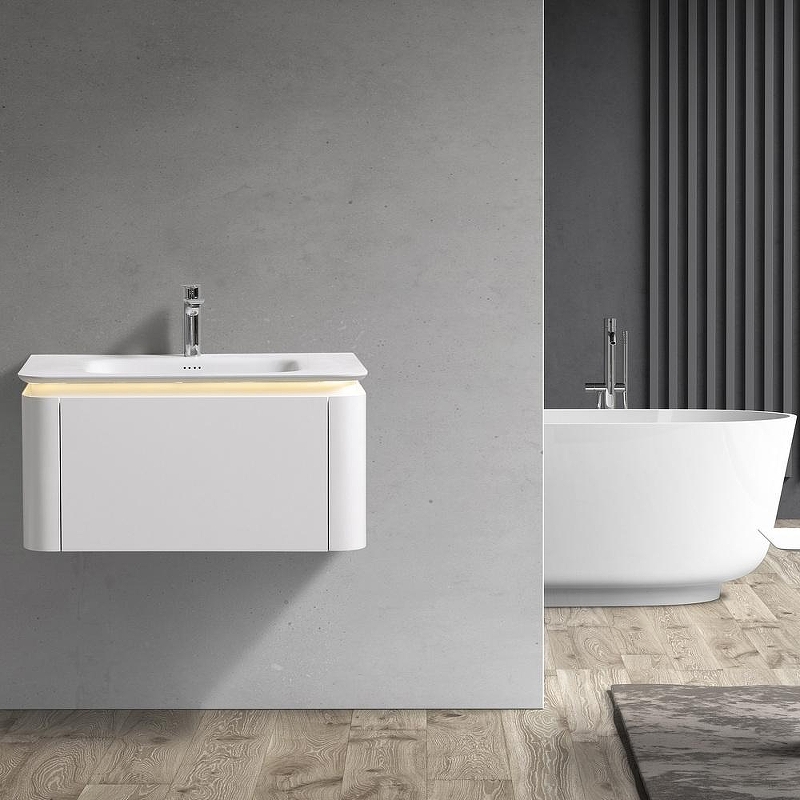 Тумба с раковиной Black&White Universe U925.900 90 925900 подвесная с подсветкой. Тумба с раковиной для ванной комнаты датского производителя Black&White. Раковина-столешница изготовлена из не пористого искусственного камня Corian, который тактильно ощущается как soft touch материал, он легок и прост в уборке,а слив оборудован донным клапаном хромированного цвета. База производится из влагостойкой девятислойной фанеры и покрыта эмалью для долгосрочного сохранения материала. Важной особенностью является контурная диодная подсветка, которая расположена по периметру столешницы. На тумбе предусмотрен один выдвижной ящик, оборудованный фурнитурой UniHopper с доводчиками.