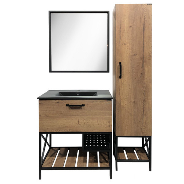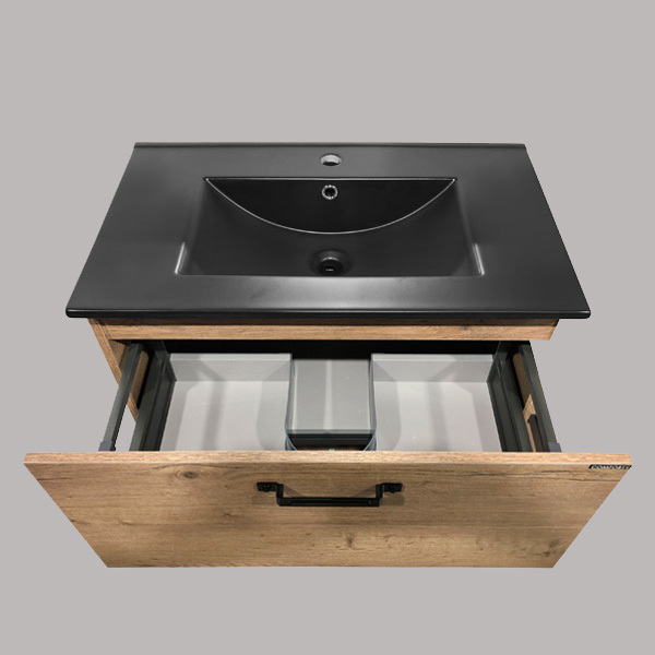 - Напольная тумба-умывальник с одним широким выкатным ящиком оснащенным системой плавного закрывания и пространствами открытого хранения.