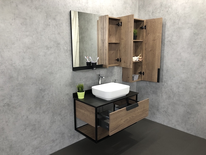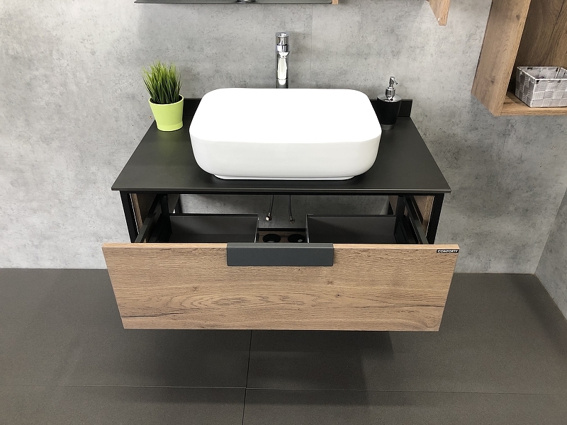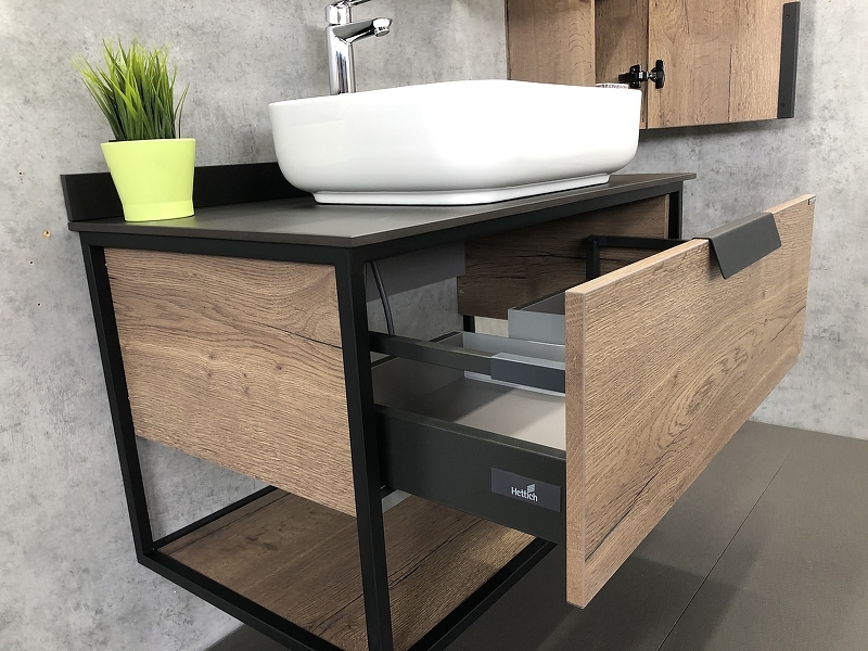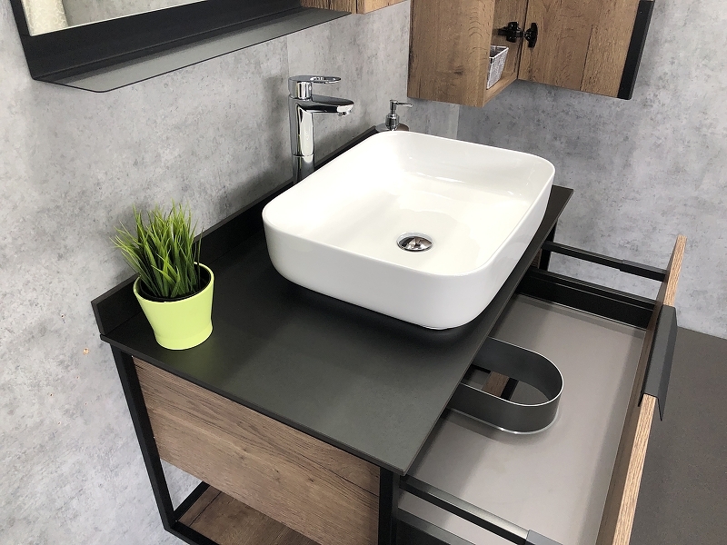 - Подвесная тумба-умывальник с одним выкатным ящиком оснащенным системой плавного закрывания и нижней полкой открытого хранения.