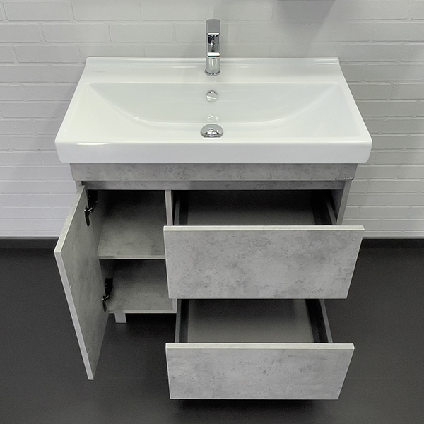 Современная тумба-умывальник с большим выбором пространств для хранения принадлежностей для умывания и бытовой химии. Тумба с одной створкой и двумя ящиками. Створка оснащена петлями с плавным закрыванием. Фасады и корпус из влагостойкого ЛДСП цвета бетон светлый. Тумба подготовлена для подключения водоснабжения снизу.