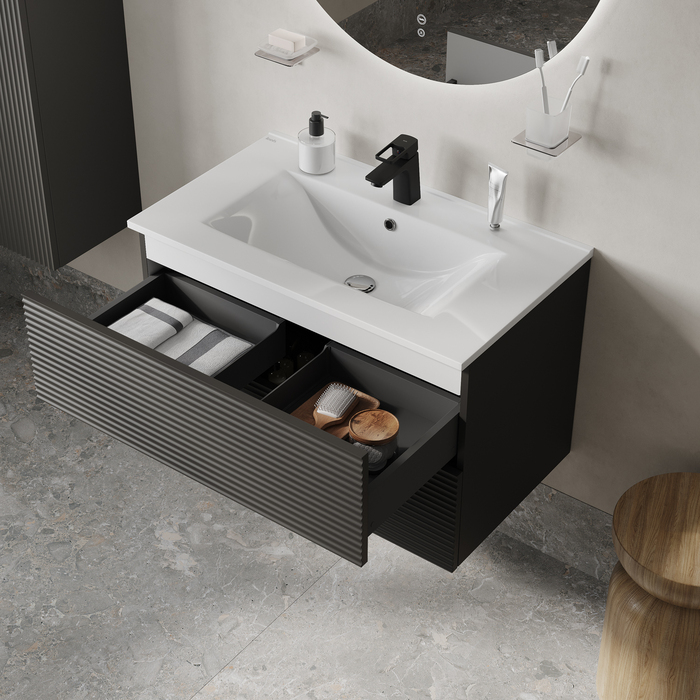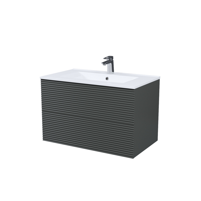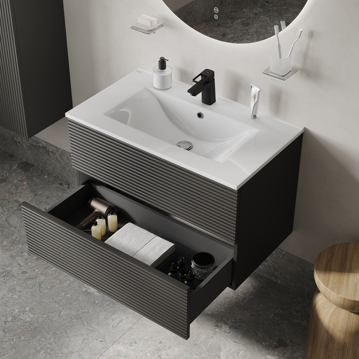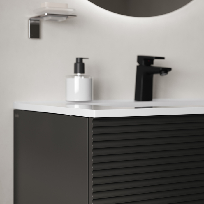 - Вместительная подвесная тумба для ванной комнаты Bild с умывальником и выдвижными ящиками – красивый дизайн с трендовой горизонтальной фрезеровкой в сочетании с популярным темно-серым цветом, удобством и практичностью.
