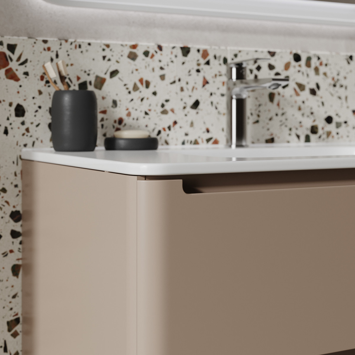 - Подвесная тумба с плоским умывальником Edifice в теплом оттенке капучино – воплощение современного минимализма. Мягкие линии корпуса в сочетании с удобными интегрированными ручками выглядят свежо и актуально. Смотрится аккуратно, легко и не усложняет процесс уборки в ванной благодаря подвесной конструкции.