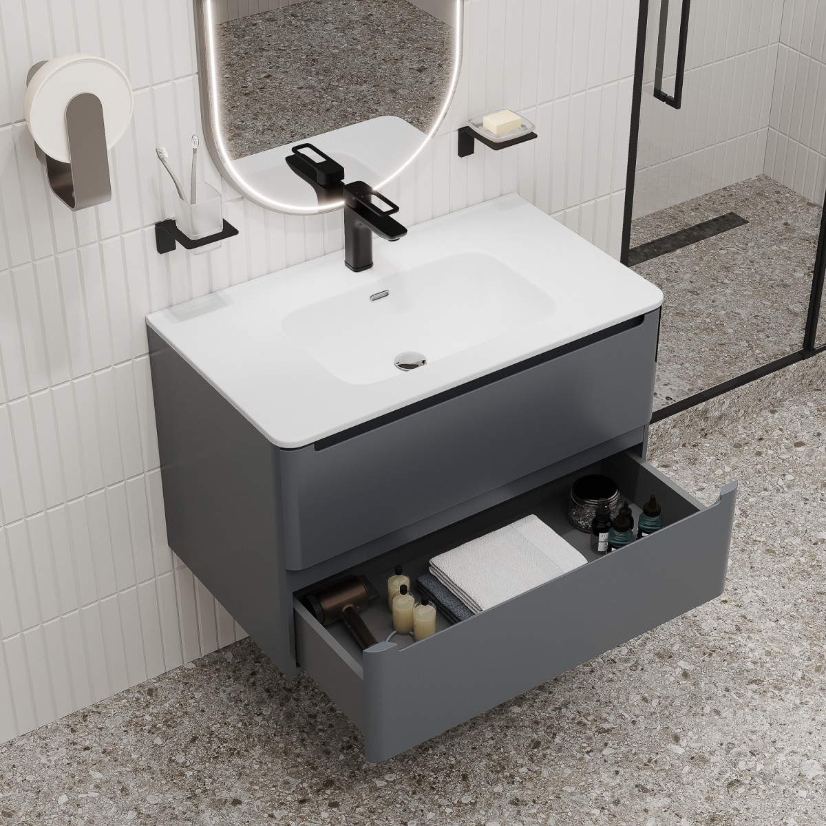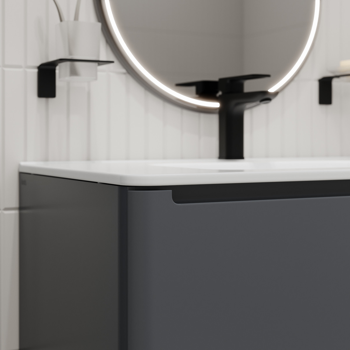 Подвесная тумба с плоским умывальником Edifice стильного темно-серого цвета – воплощение современного минимализма. Мягкие линии корпуса в сочетании с удобными интегрированными ручками выглядят свежо и актуально. Смотрится аккуратно, легко и не усложняет процесс уборки в ванной благодаря подвесной конструкции.