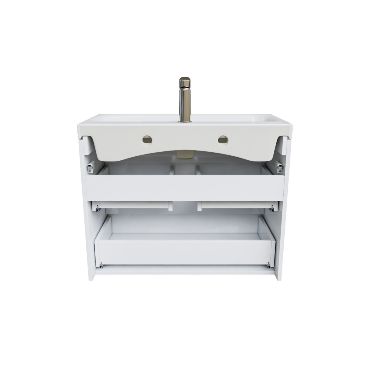• Два вместительных выдвижных ящика с механизмом плавного доведения закрываются плавно и бесшумно. Интегрированные ручки. Фурнитура рассчитана на 30 000 открываний, что составляет более 10 лет исправной работы.
