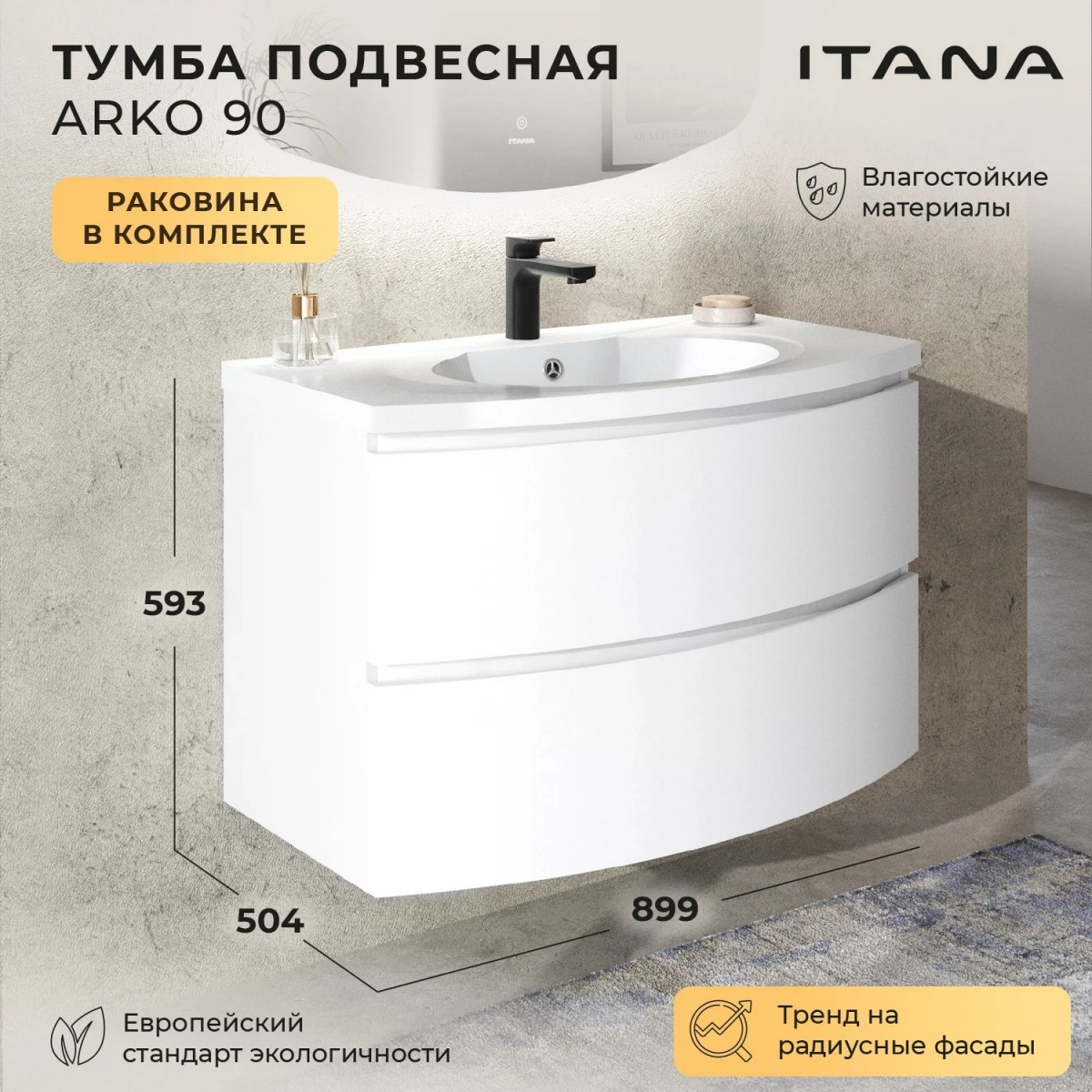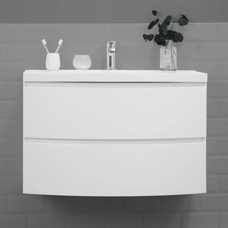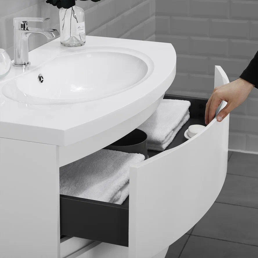 Тумба с раковиной Итана Arko 90 не только станет стильным акцентом для вашей ванной комнаты, но и обеспечит максимальную функциональность и удобство в использовании. Эстетически привлекательный дизайн с радиусными фасадами подчеркивает современный стиль интерьера, а белый матовый оттенок придаёт свежесть и легкость любому пространству. Эта подвесная тумба для ванной имеет размеры 899х504х593 мм, что позволяет идеально вписаться как в малогабаритные помещения, так и в просторные ванные комнаты. Благодаря подвесной конструкции, такая мебель значительно упрощает уборку, обеспечивая легкий доступ к полу. Великолепное сочетание формы и функциональности делает эту тумбу с раковиной отличным выбором как для семей, так и для индивидуального использования. Удобство использования обеспечивает хорошо продуманная раковина, которая гармонично сочетается с тумбой и создаёт единый ансамбль. Мебель изготовлена из высококачественных материалов, что гарантирует долгий срок службы и сохранность внешнего вида на протяжении многих лет. Ценителям эстетики и практичности понравится емкость и анатомически правильная конструкция ящиков, которые позволяют удобно сортировать и хранить всевозможные принадлежности для ванной комнаты. Подвесная тумба для ванной комнаты Итана Arko 90 идеально подходит для тех, кто ценит высокое качество и стремится к функциональной организации своей ванной.Продуманное до мелочей исполнение фасадов, мягкость линий и современный дизайн делают её отличным дополнением к любой ванной комнате.