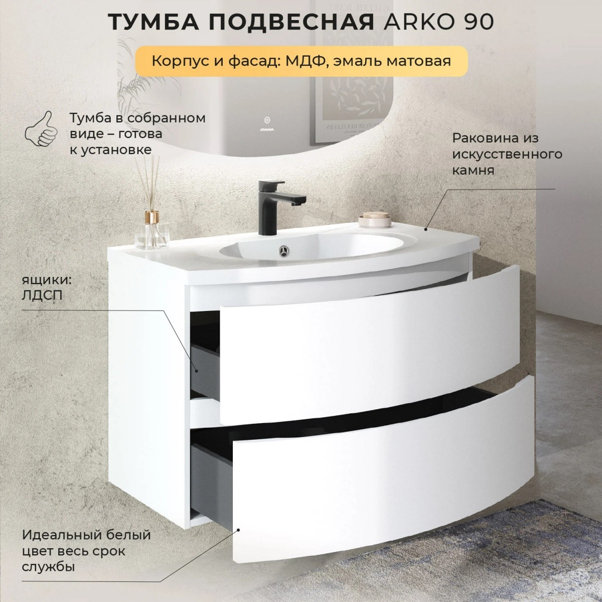 Тумба с раковиной Итана Arko 4657825873782 90 см (эмаль белый матовый) подвесная