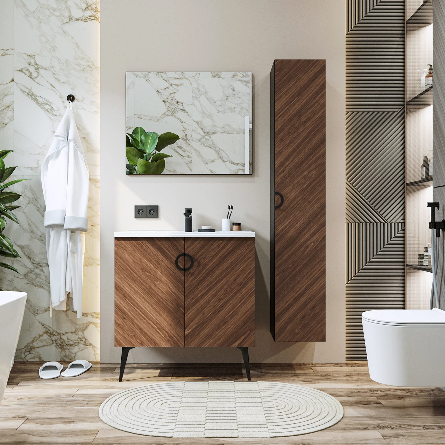 Коллекция Palladio - великолепное звучание современной классики. Изящные пропорции и нестандартный подход к дизайну с сохранением функциональности. Коллекция выполнена из ЛДСП в модных деревянных декорах. Технология производства позволила сделать элементы мебели устойчивыми к влаге. Качественная фурнитура с доводчиками обеспечивает легкое открывание и плавное закрывание дверей. Дизайнерские металлические ручки с покрытием - не только декоративный элемент, но и удобное решение - фасады остаются чистыми при постоянном открывании и закрывании.