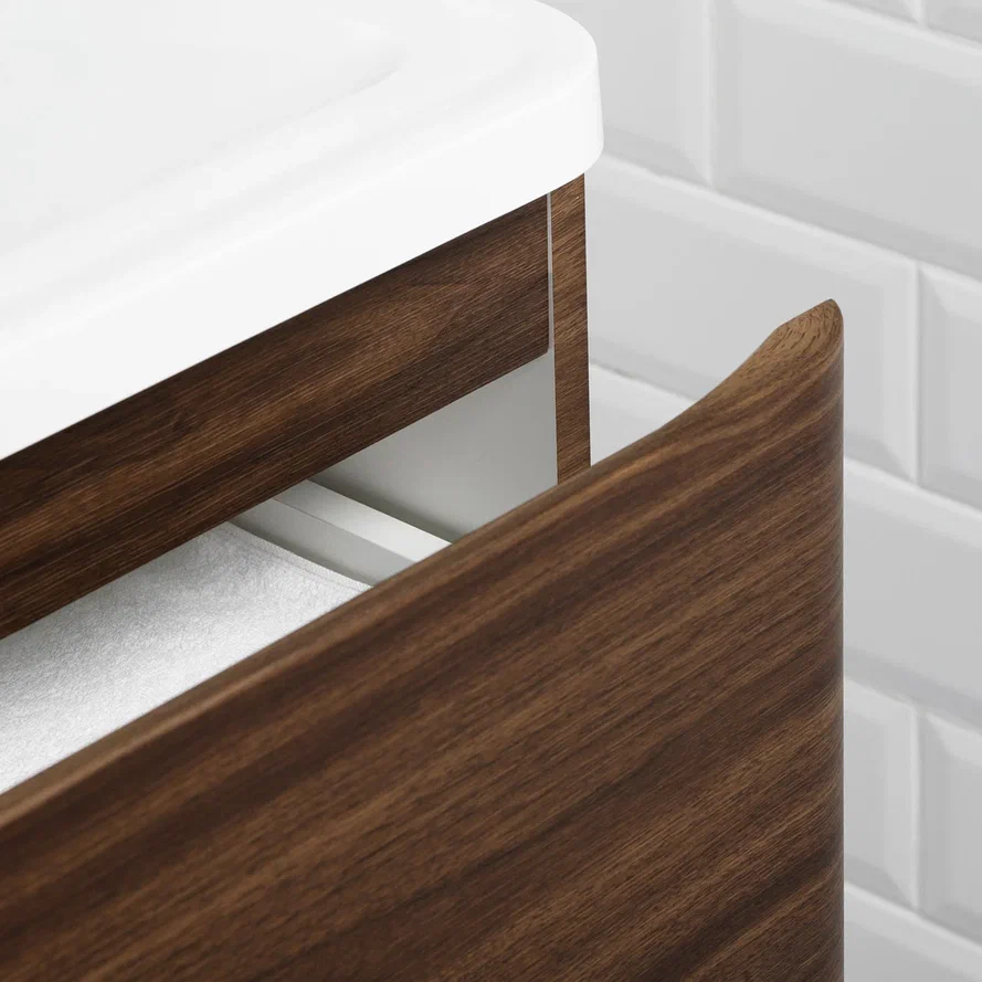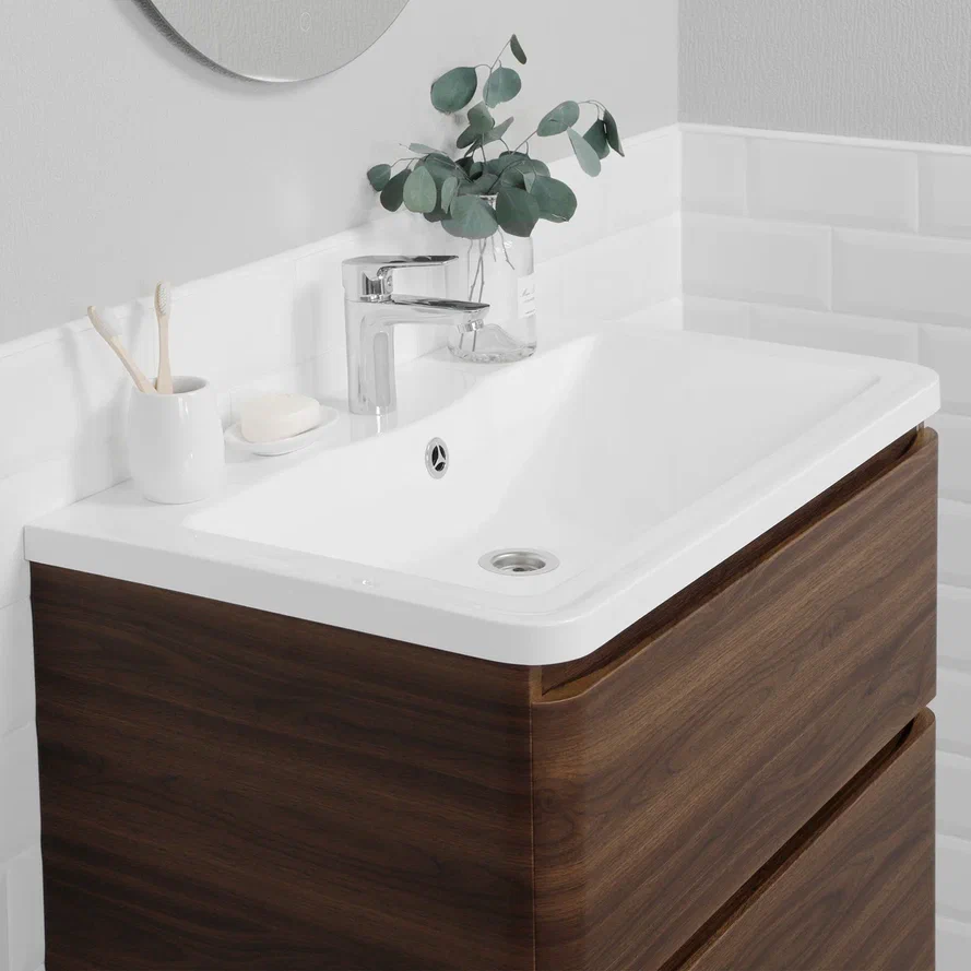 Умывальник полностью закрывает корпус тумбы для ванной комнаты, что обеспечивает дополнительную защиту от воды.