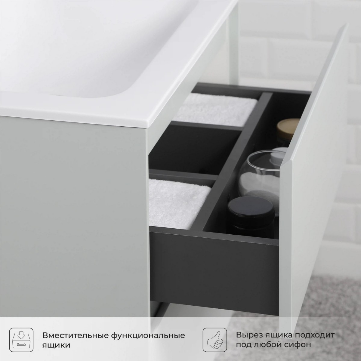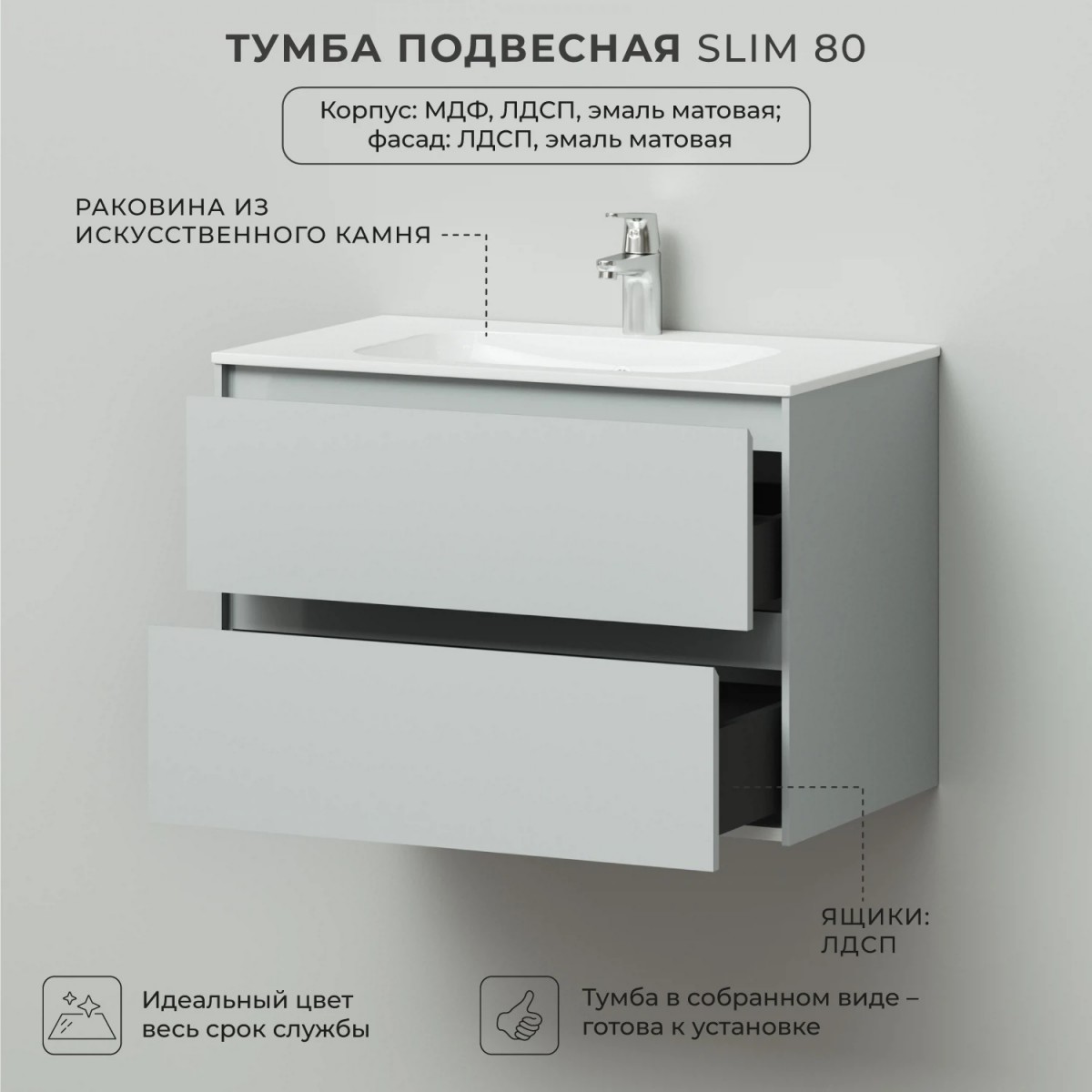 В коллекции Slim безупречно воплотилась простая геометрия мебели. Идеальные прямые линии, вкладные фасады, тонкая рамка корпуса, отсутствие лицевой фурнитуры – лаконичность, которая восхищает. Коллекция выполнена из влагозащищенного МДФ, покрытого матовой эмалью. Мебель прослужит долгие годы, не теряя своего идеального внешнего вида. Тумба укомплектована изящной белоснежной раковиной из искусственного камня простого дизайна. Комплект имеет подвесную систему крепления, что обеспечивает свободный доступ для поддержания чистоты в ванной комнате.