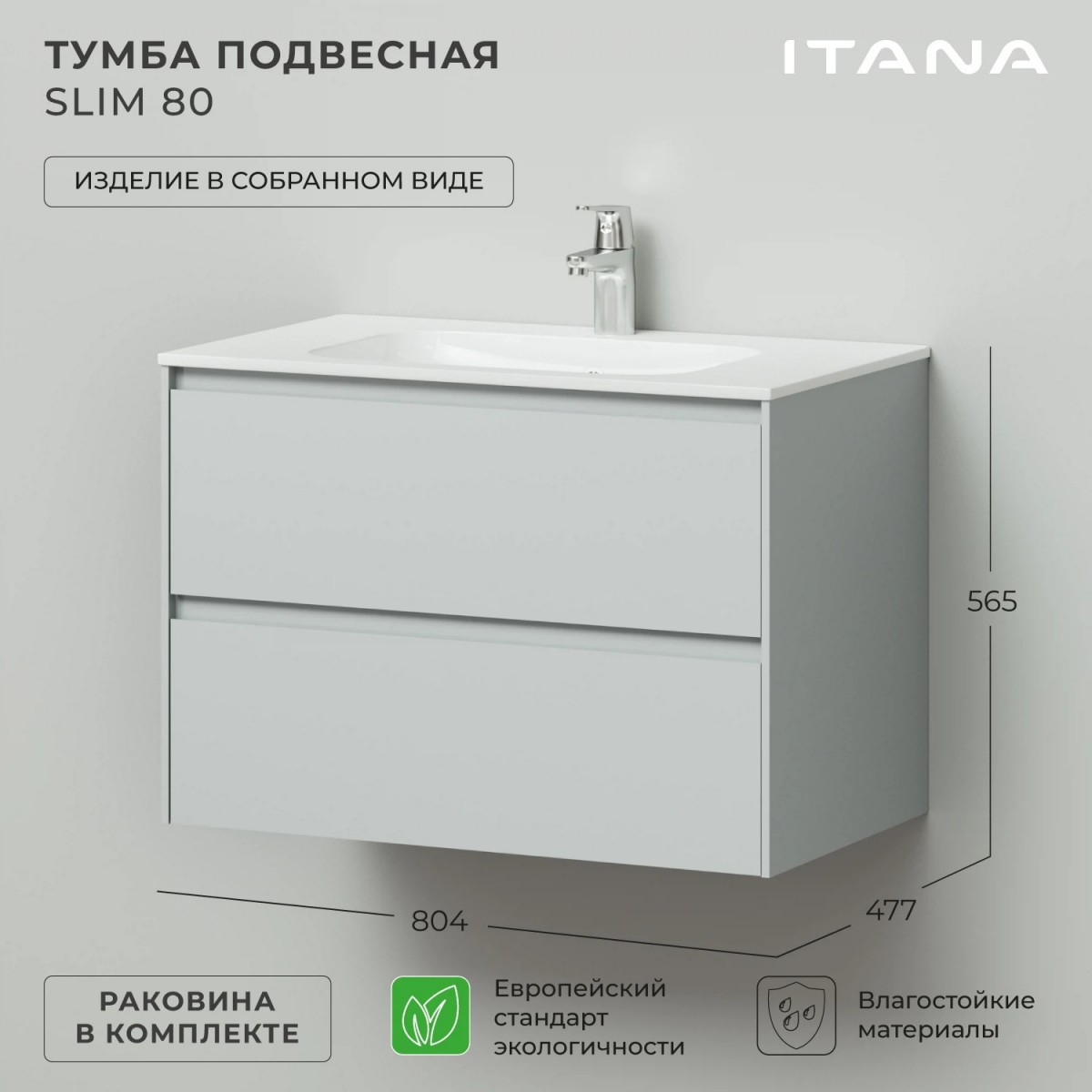 Тумба с раковиной Итана Slim 4657810334335 80 см (серо-зеленый матовый) подвесная