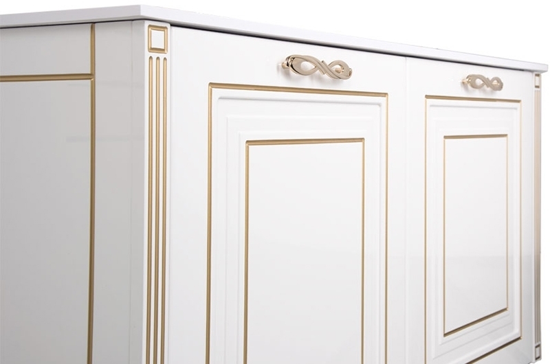 Тумба под раковину на ножках Aquanet Паола 120 186114 с двумя распашными дверцами и внутренней полкой из ударопрочного стекла. Классические формы в сочетании с передовыми технологиями. Фрезеровку и пилястры золотого цвета дополняют изящные и устойчивые к воздействию влаги и истиранию ручки итальянского разработчика мебельной фурнитуры Sagittario. Благодаря механизму доводчиков дверцы закрываются бесшумно и легко. Тумба предназначена для использования в ванных комнатах с повышенной влажностью. Соответствует стандартам безопасности.