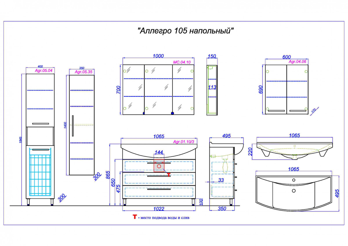 Тумба под раковину Aqwella Аллегро Agr.01.10/3 105 см (белый) напольный