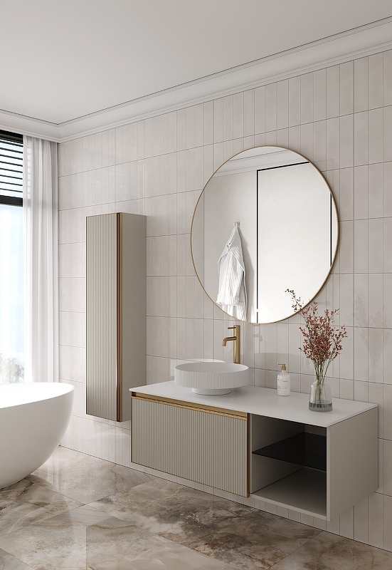 Тумба под раковину ArmadiArt Quatro 6 790-M6-120-CM-RIB-MG 120 см (кашемир рифлёный/золото матовое) подвесная