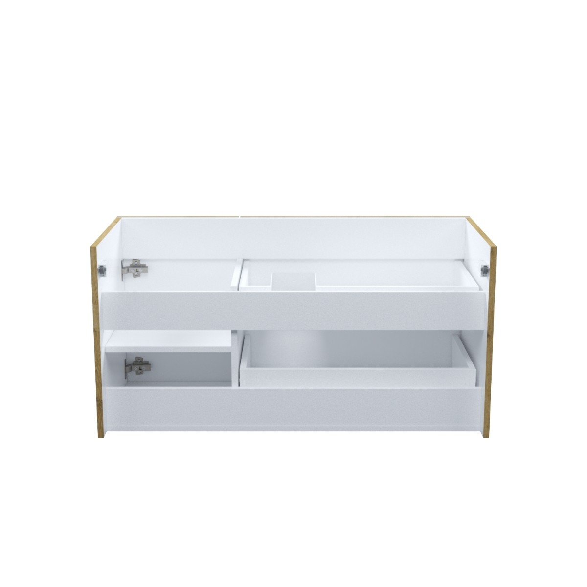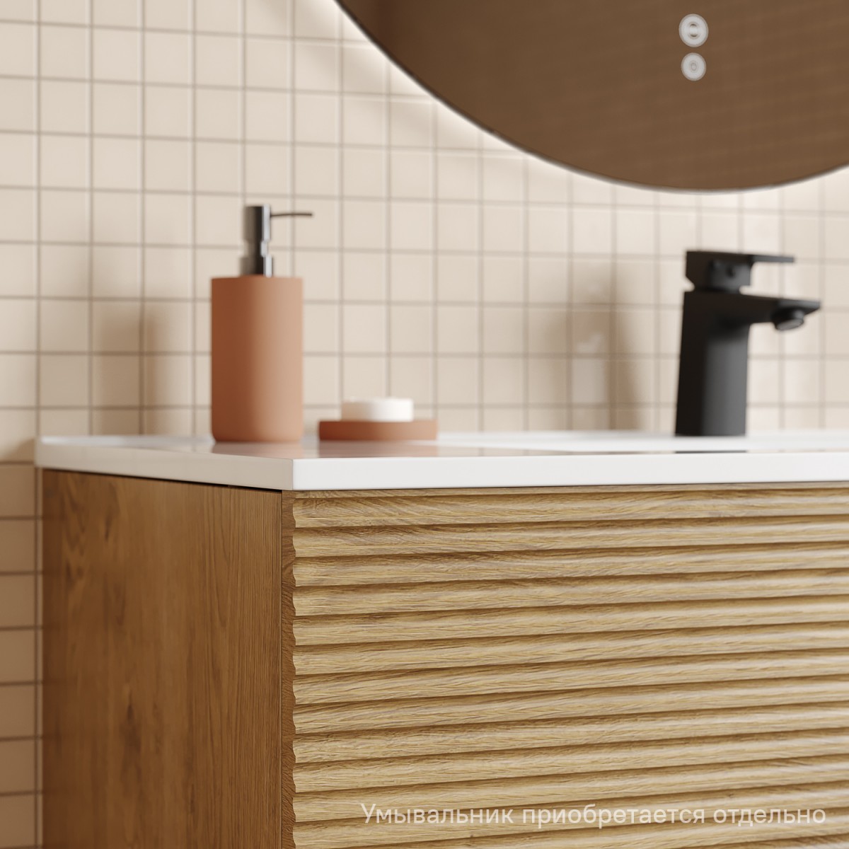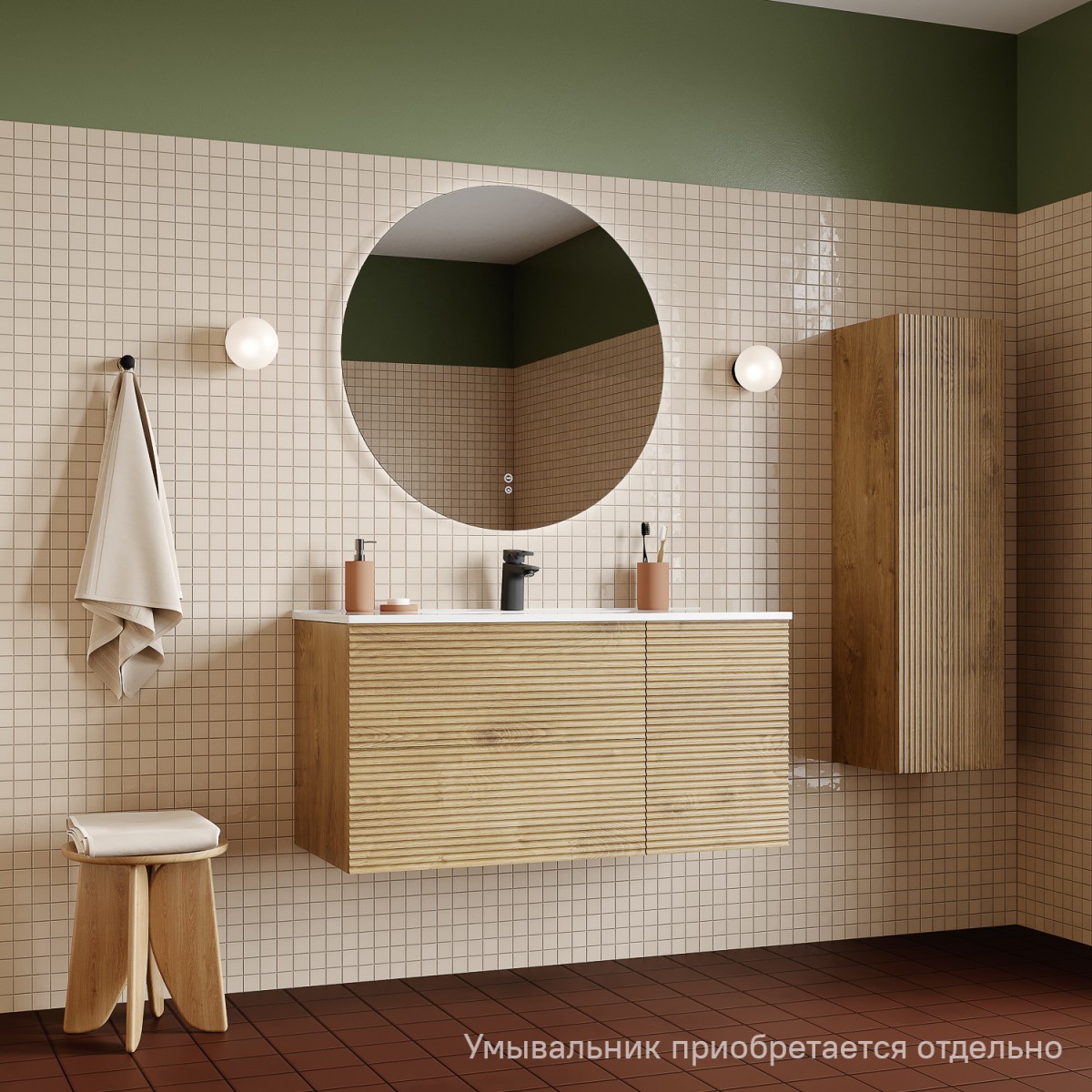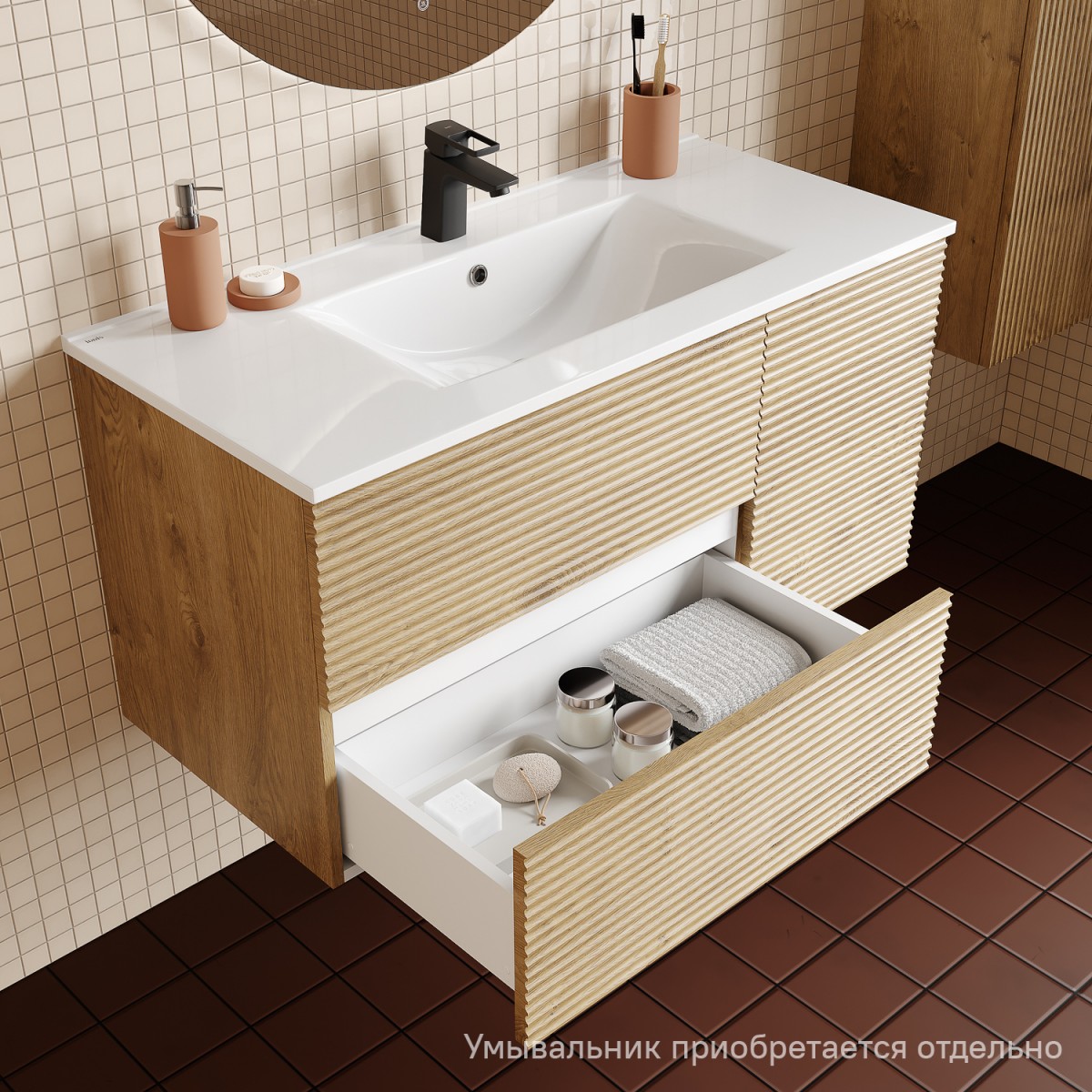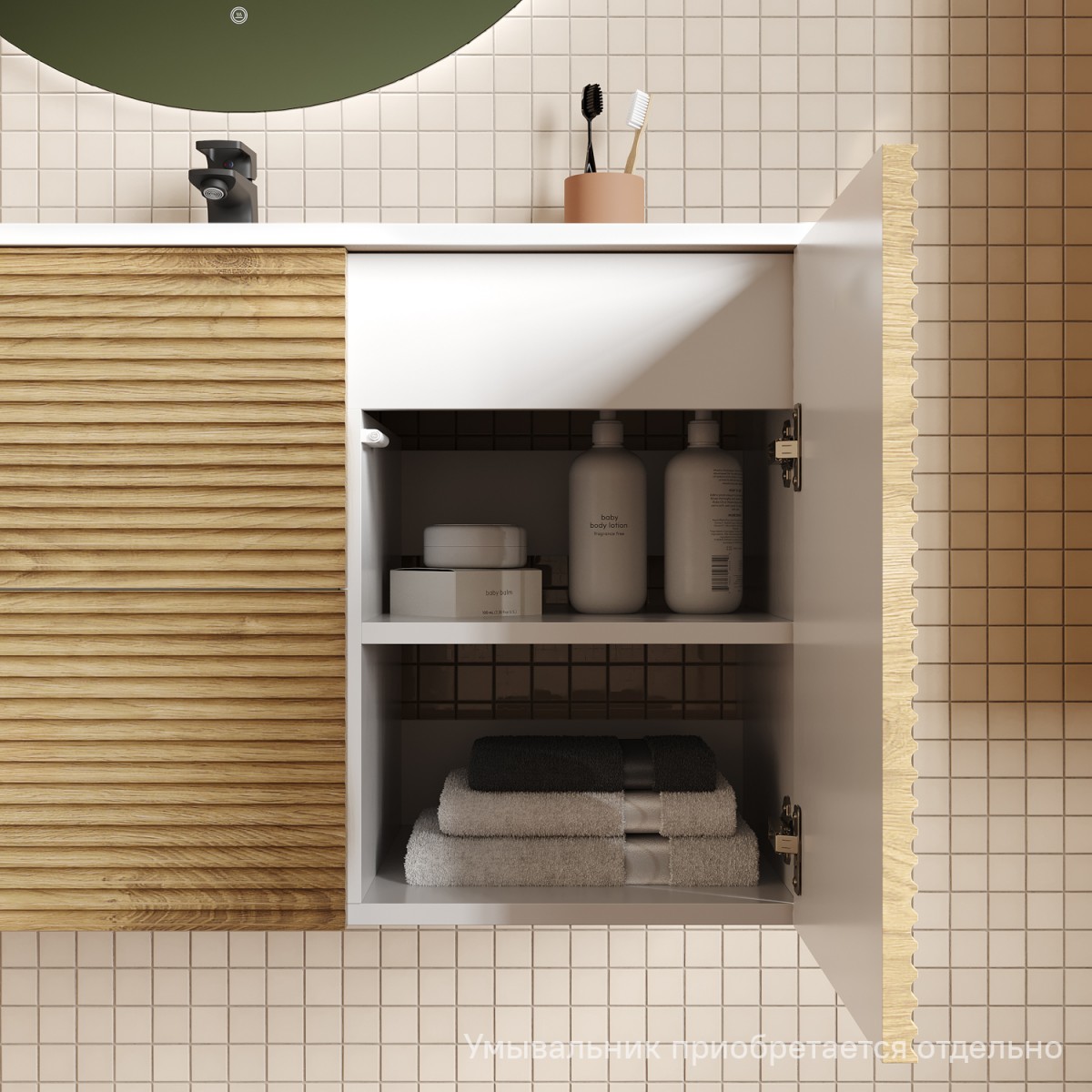 - Вместительная подвесная тумба для ванной комнаты Bild с ящиками и полками – красивый дизайн со структурной горизонтальной фрезеровкой в сочетании с теплым оттенком дуба, удобством и практичностью. Без умывальника в комплекте (подходит умывальник IDDIS® арт. 0131000i28).