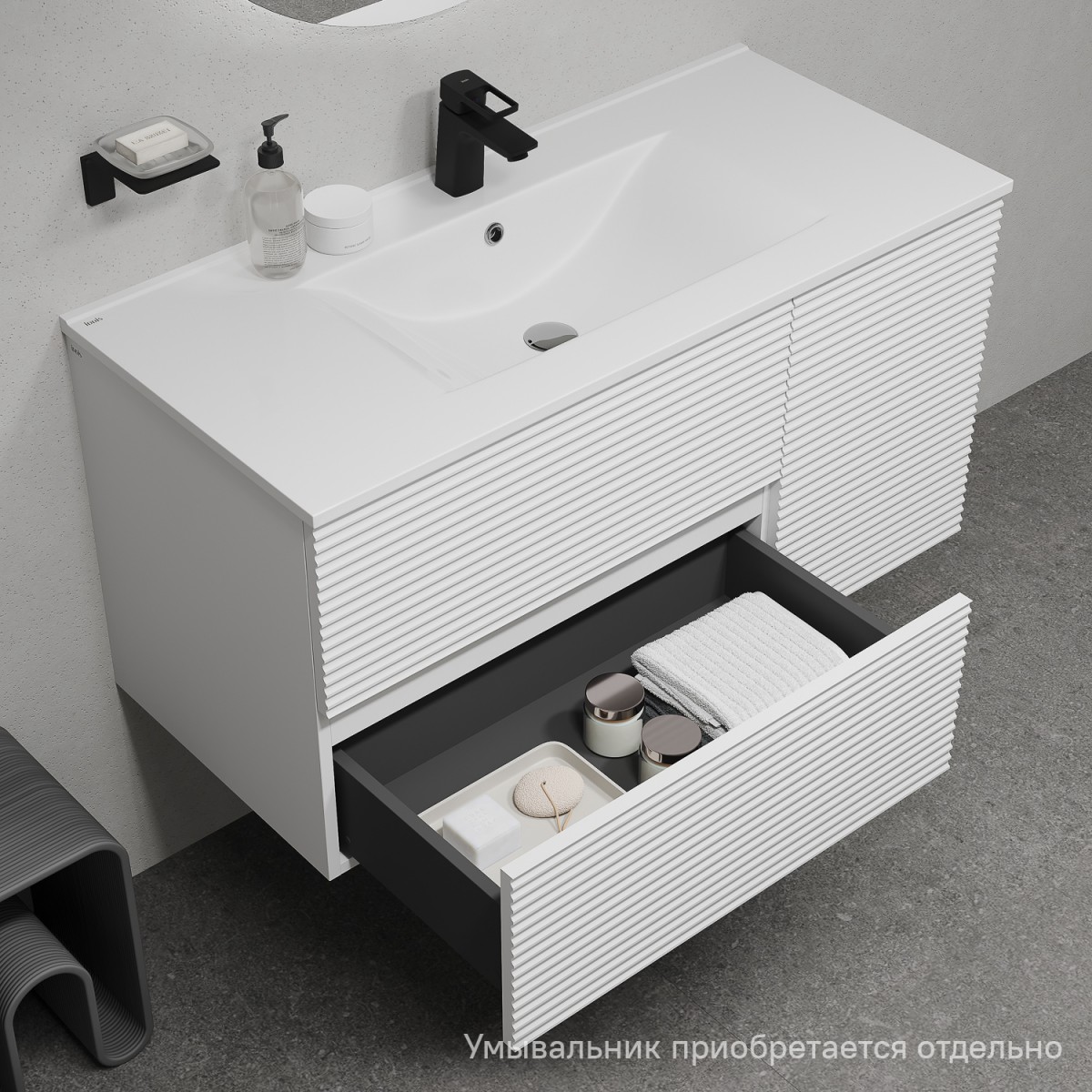 - Вместительная подвесная тумба для ванной комнаты Bild с выдвижными ящиками и полками – красивый дизайн с трендовой горизонтальной фрезеровкой в сочетании с универсальным белым цветом, удобством и практичностью. Без умывальника в комплекте (подходит умывальник IDDIS® арт. 0131000i28).