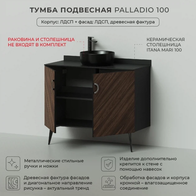 Коллекция Palladio - великолепное звучание современной классики. Изящные пропорции и нестандартный подход к дизайну с сохранением функциональности. Коллекция выполнена из ЛДСП в модных деревянных декорах. Технология производства позволила сделать элементы мебели устойчивыми к влаге. Качественная фурнитура с доводчиками обеспечивает легкое открывание и плавное закрывание дверей. Дизайнерские металлические ручки с покрытием - не только декоративный элемент, но и удобное решение - фасады остаются чистыми при постоянном открывании и закрывании. Укомплектуйте тумбу раковиной из искусственного камня нашего производства или столешницей из керамогранита и настольной раковиной.