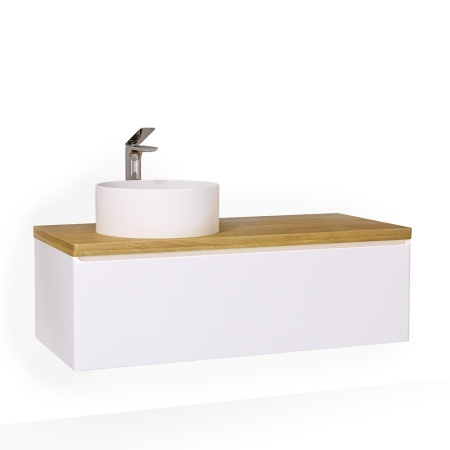 Корпус тумбы с изящной интегрированной ручкой на фасаде выполнен из МДФ в пленке. Столешница из цельного массива бука покрыта влагостойким лаком. У тумбы есть дополнительный скрытый ящик, в котором имеется органайзер со стеклянными перегородками