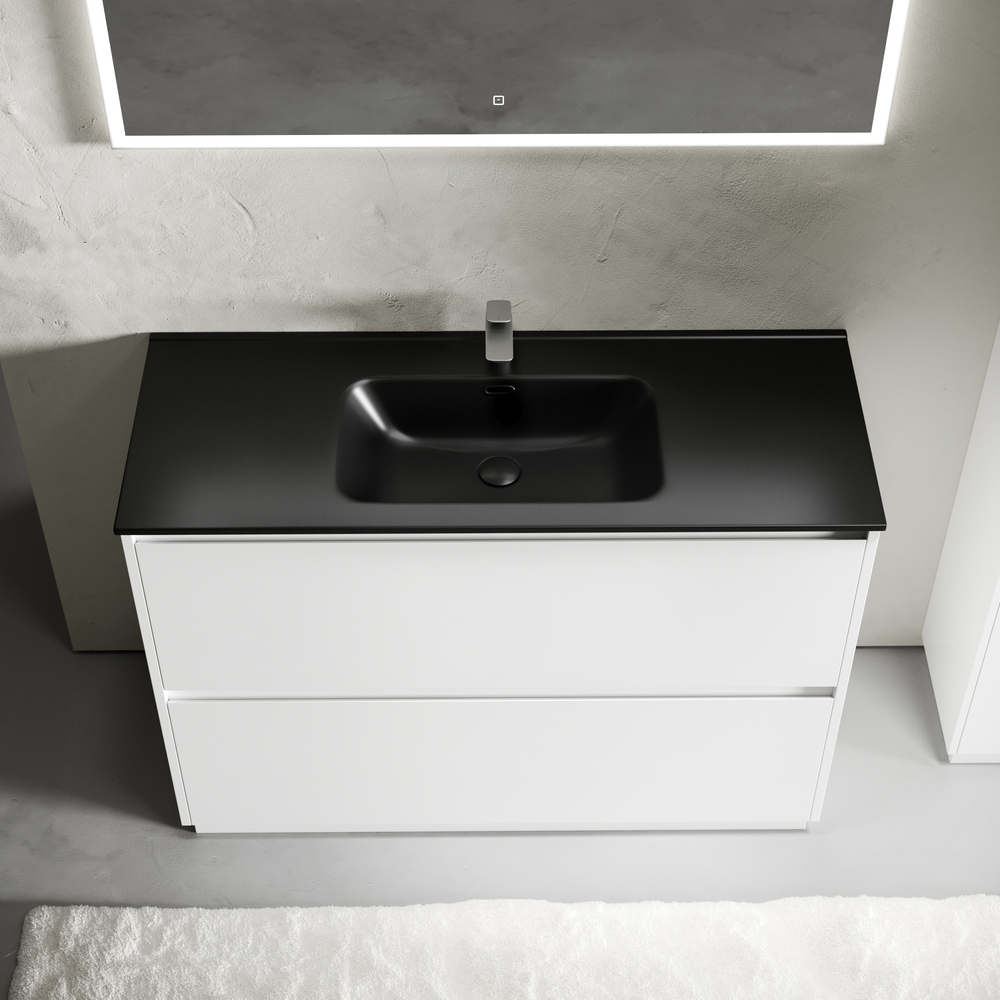 Тумба напольная Libra c двумя ящиками с доводчиками скрытого монтажа, с системой плавного закрывания и с ручкой по всей длине ящика. Каркас и фасад тумбы выполнен из МДФ, покрытие эмаль, цвет белый глянец. Основание тумбы имеет ножки c регулировкой высоты до10 мм для компенсации возможной неровности напольного покрытия. Внутреннее пространство тумбы выполнено из надежного ЛДСП серого цвета. Размер 1190х450х840, артикул LB120F-1W