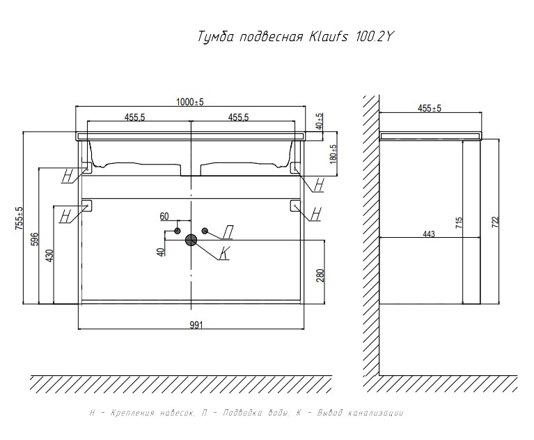 Размер тумбы с раковиной: Ш1000±5хГ455±5хВ755±5 мм (раковина Como 100)