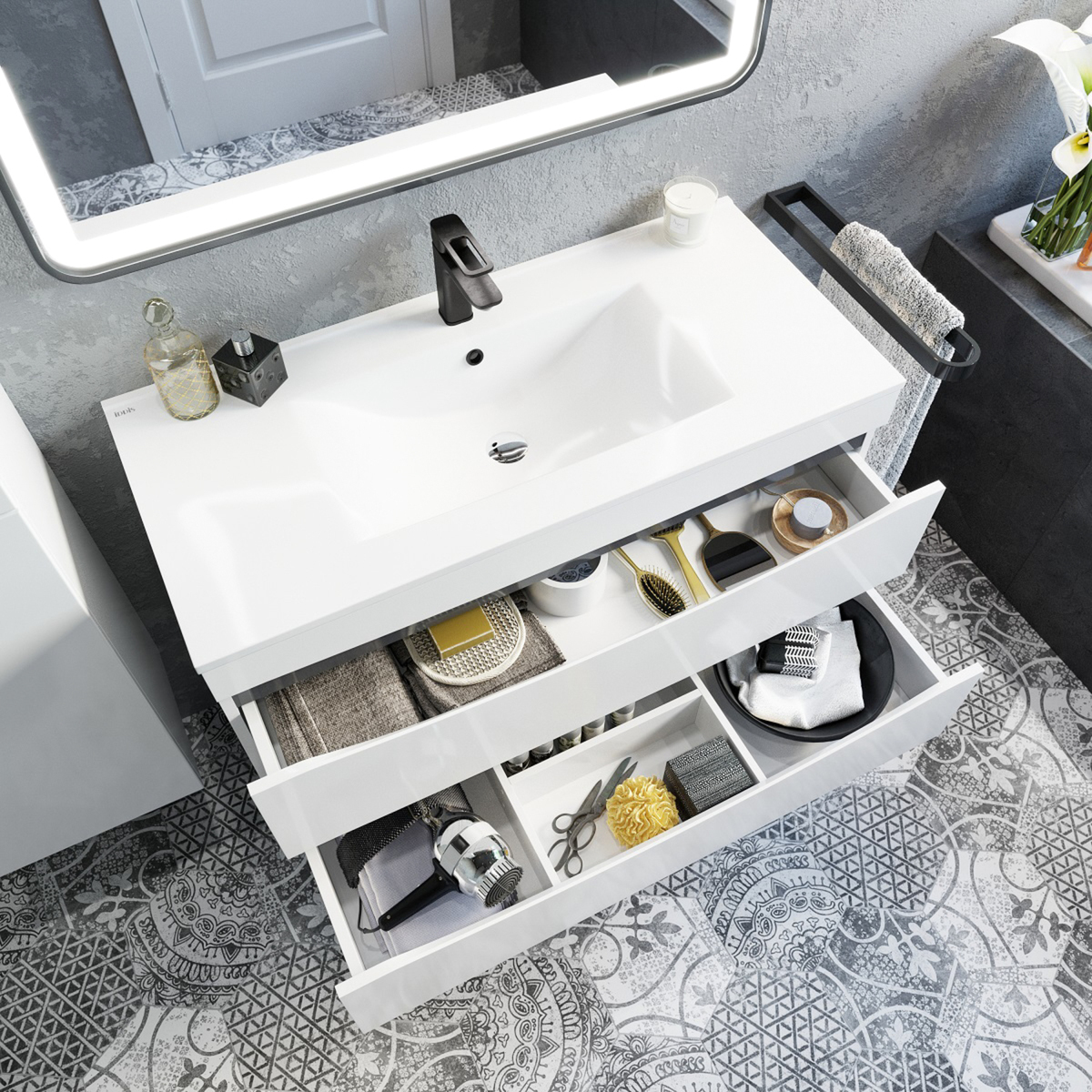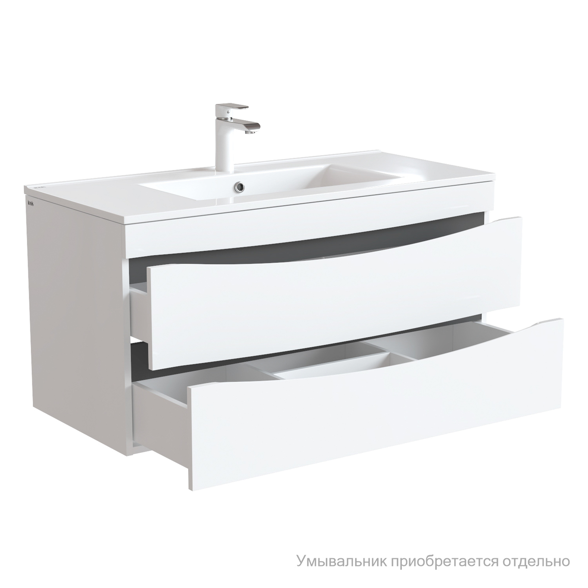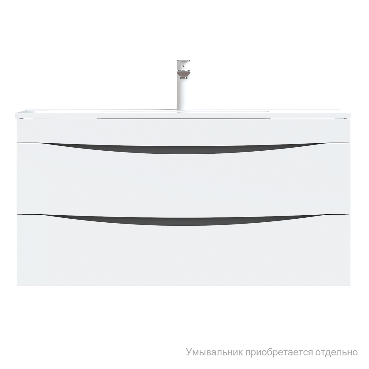 Тумба для ванной комнаты, подвесная. Размеры: 455х1003х500 мм (ДхШхВ). Фасад МДФ 19 мм в эмали (белая), фрезеровка. Корпус влагостойкий ЛДСП 16 мм в эмали. Интегрированные ручки. Два выдвижных ящика с механизмом плавного доведения. Пластиковый ограничитель под сифон в верхнем ящике. Перекатной организатор в нижнем ящике. Навесы усиленные с планкой. Упаковка: картон, пленка, пенопластовые уголки.