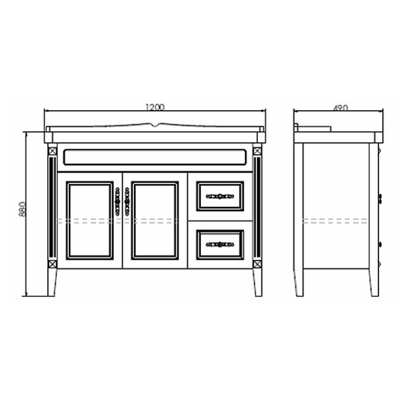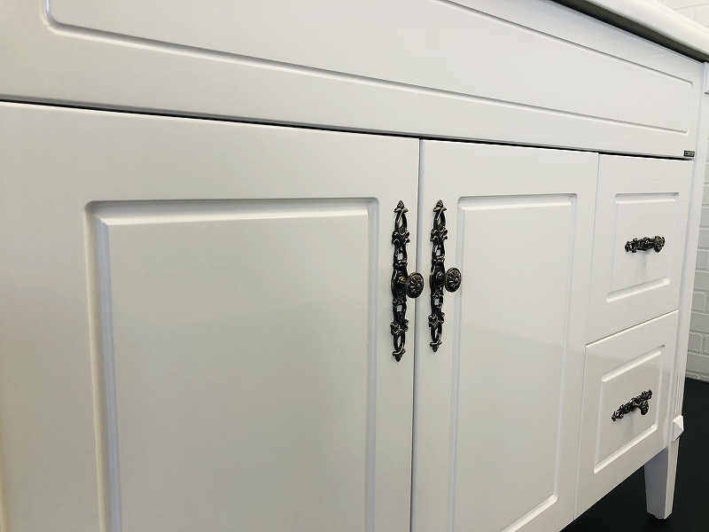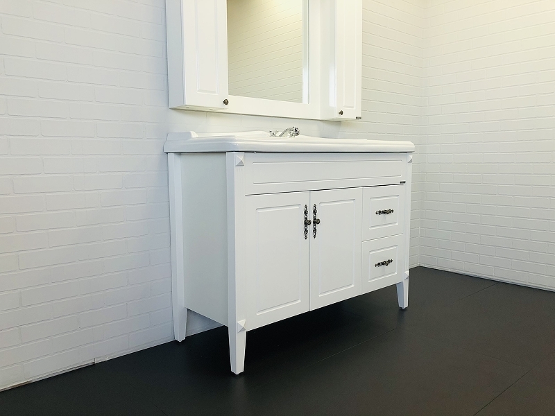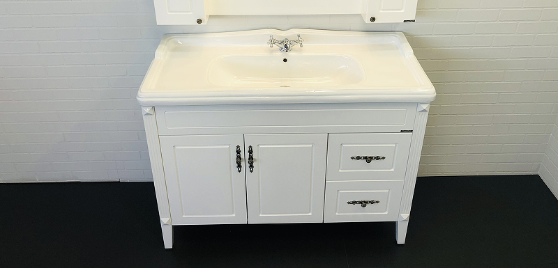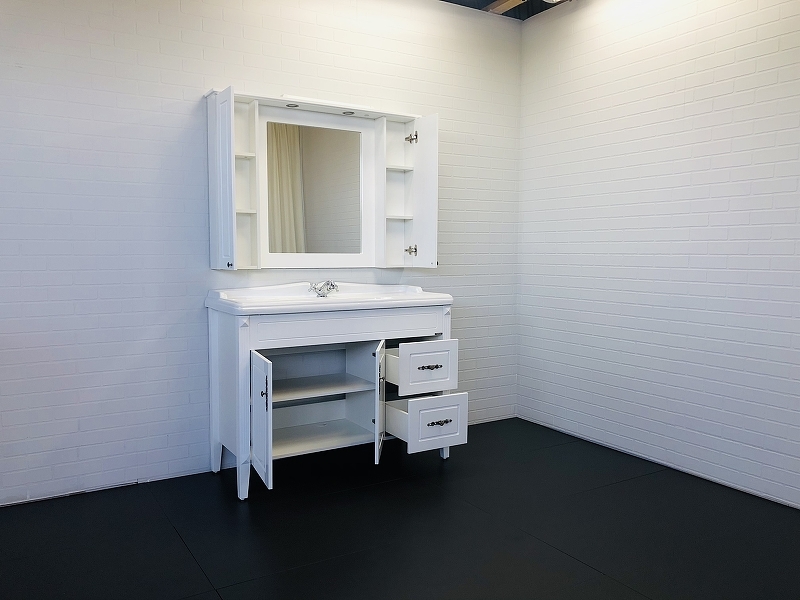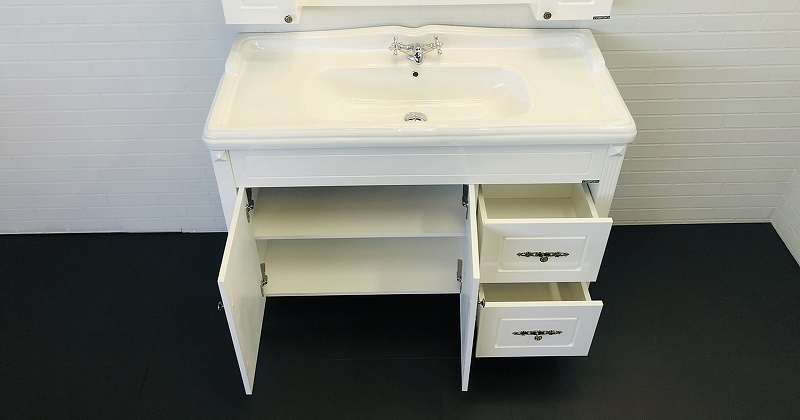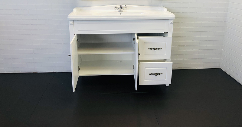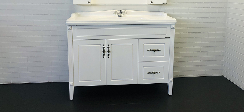 - Широкая - 120 см - тумба-умывальник с двумя створками и двумя ящиками.