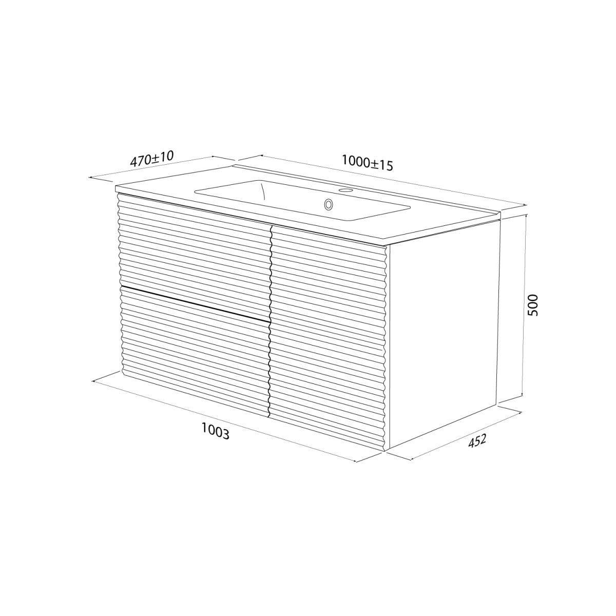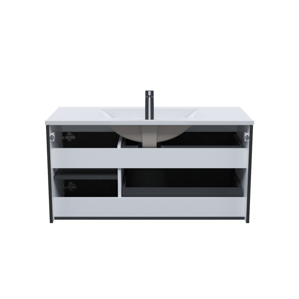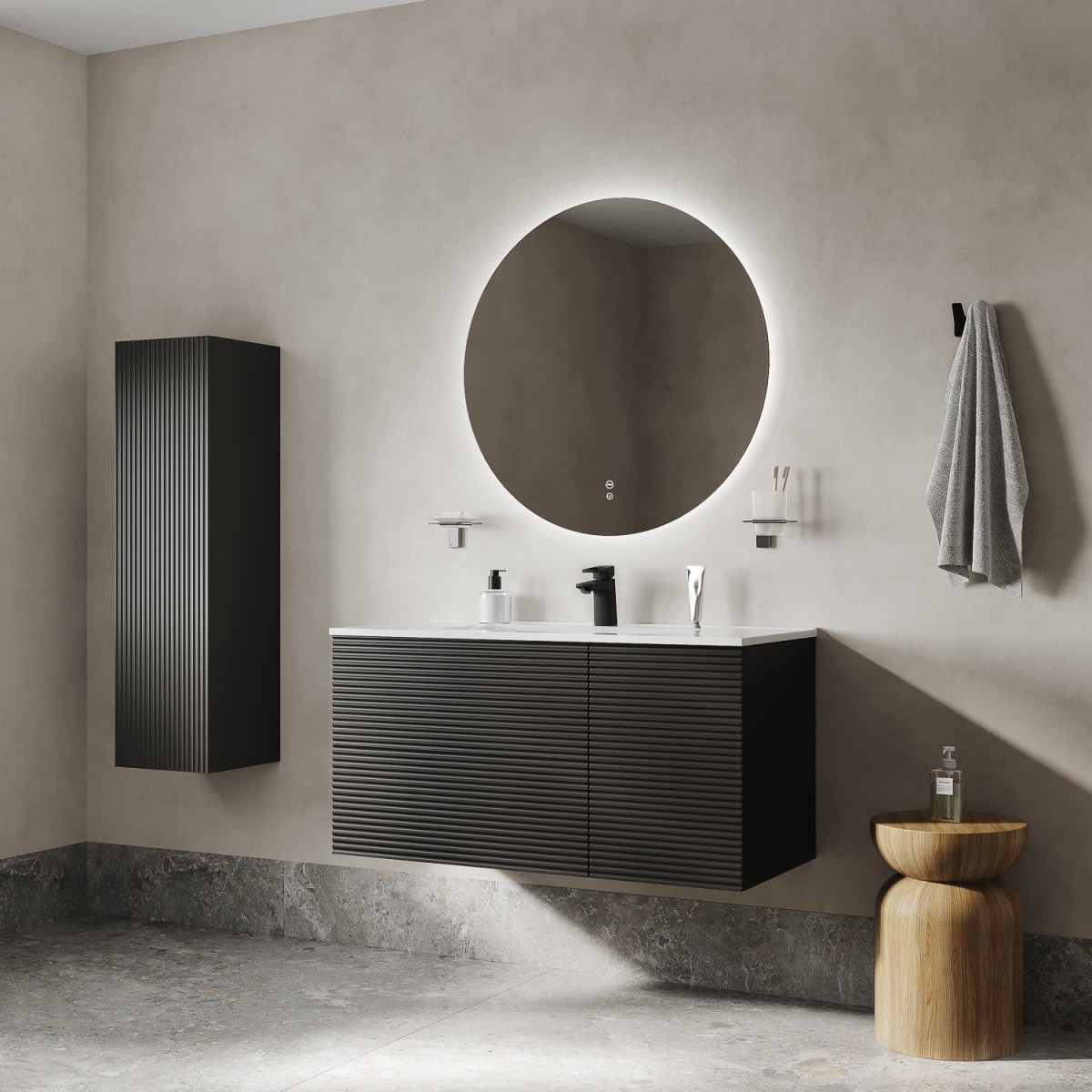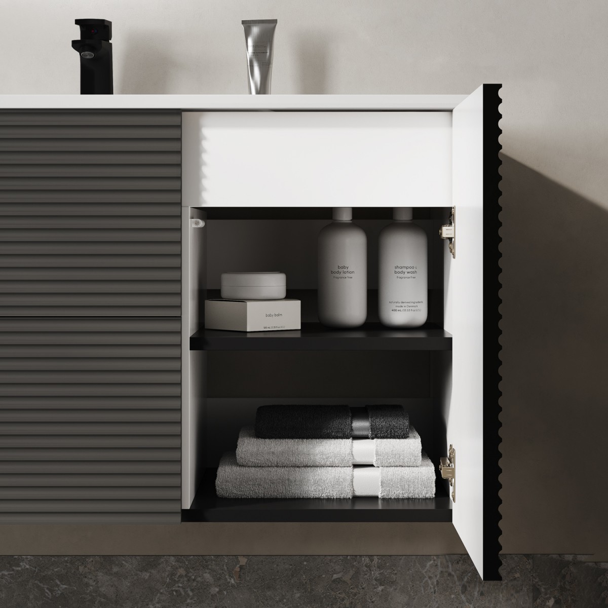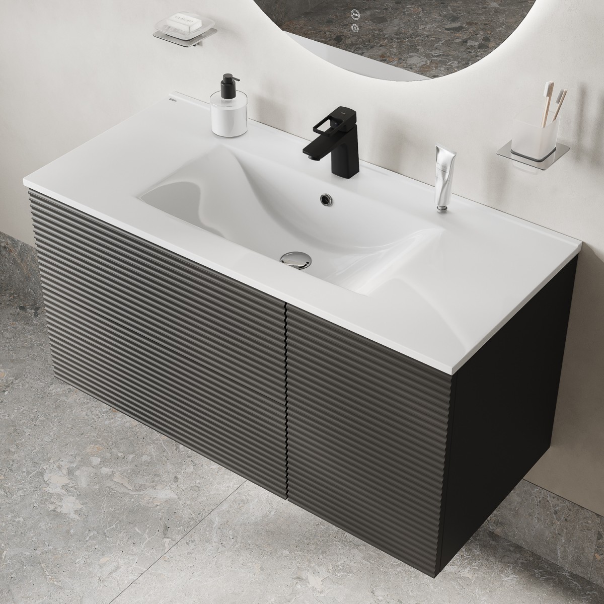 - Вместительная подвесная тумба для ванной комнаты Bild с умывальником и выдвижными ящиками и полками – красивый дизайн с трендовой горизонтальной фрезеровкой в сочетании с популярным темно-серым цветом, удобством и практичностью.
