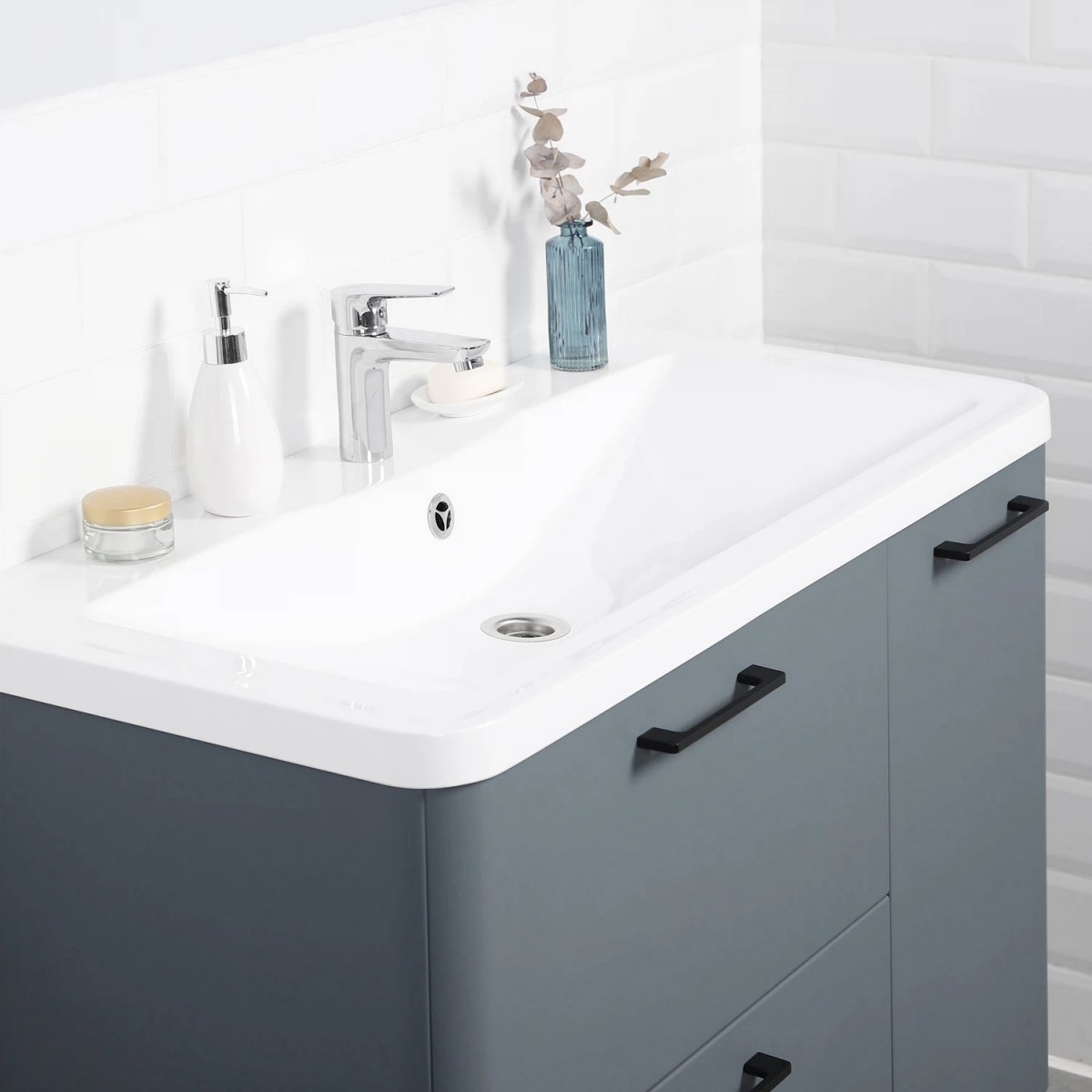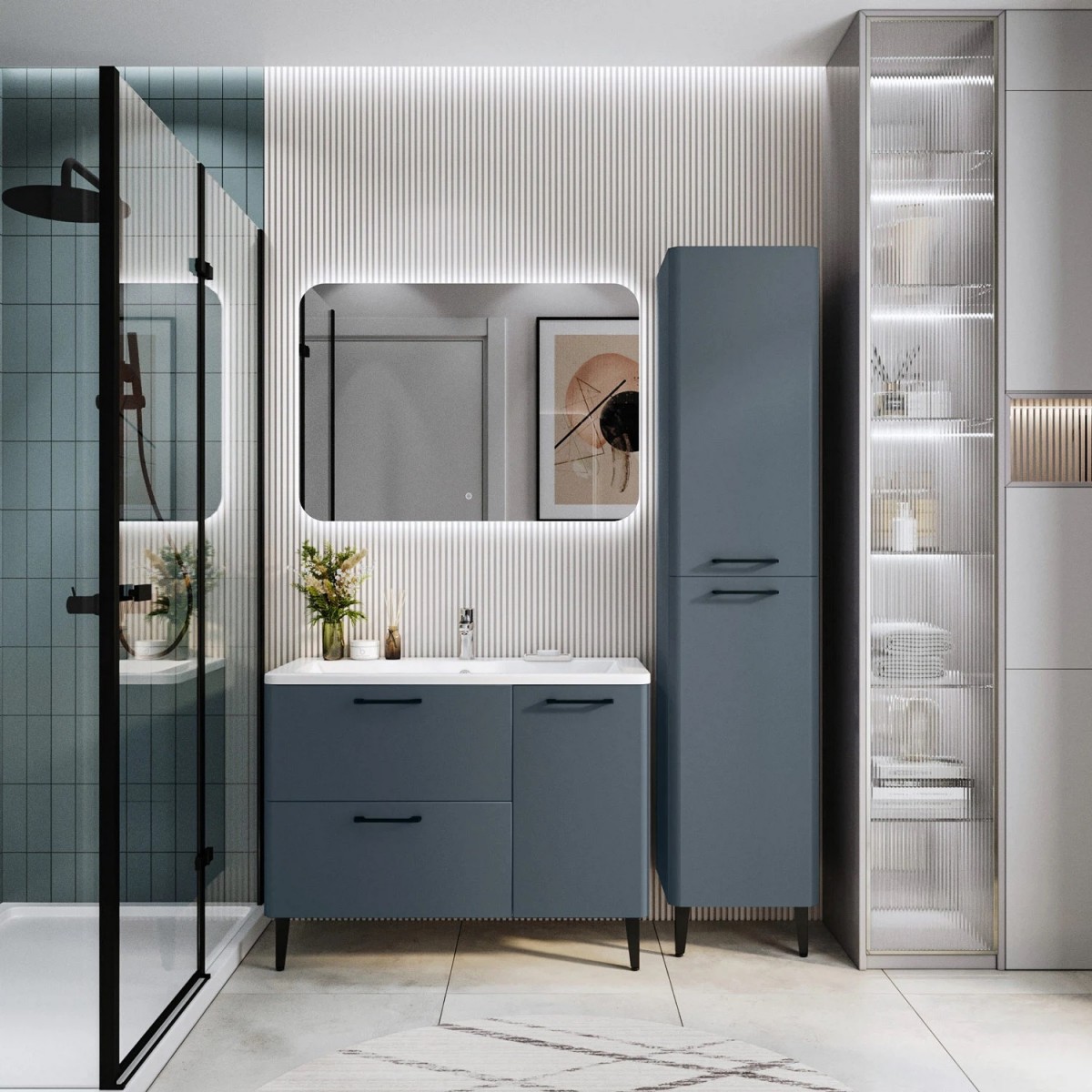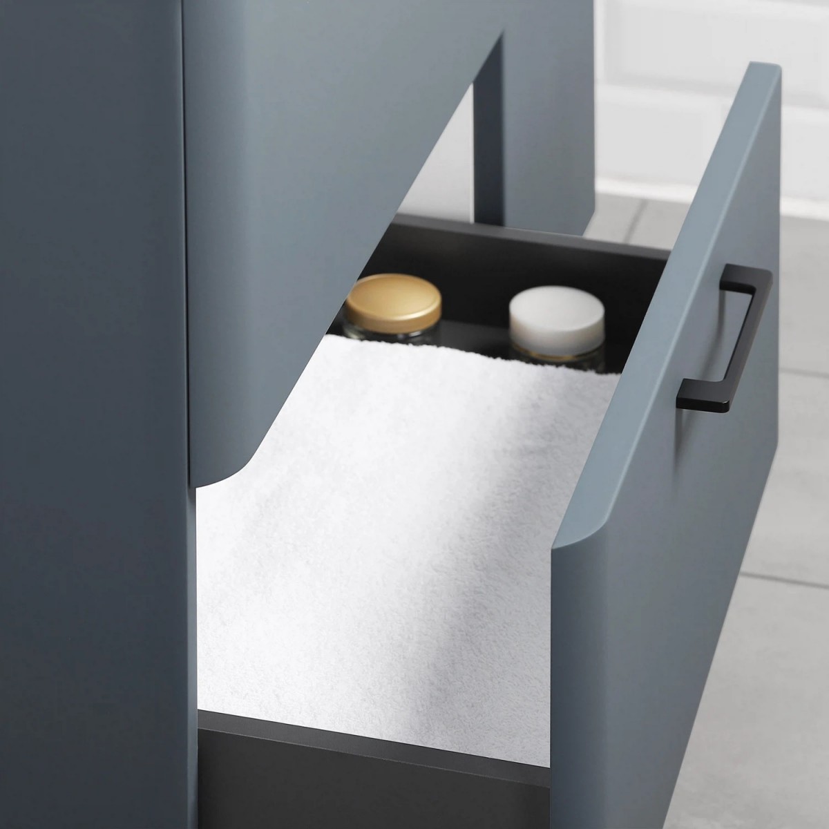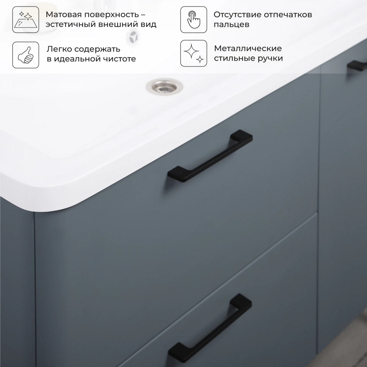 Напольная тумба с раковиной из коллекции Nais 2.0 на высоких черных ножках станет настоящим украшением ванной комнаты в современном, скандинавском стиле. Изделие изготовлено из прочного МДФ, поэтому выдерживает высокие эксплуатационные нагрузки. Корпус и фасады покрыты матовой пленкой, что обеспечивает дополнительную защиту мебели от влаги и перепадов температуры. Качественная фурнитура с доводчиками обеспечивает легкое открывание и плавное закрывание ящиков. Черная матовая ручка уникального дизайна придает изделию богатый, статусный вид.