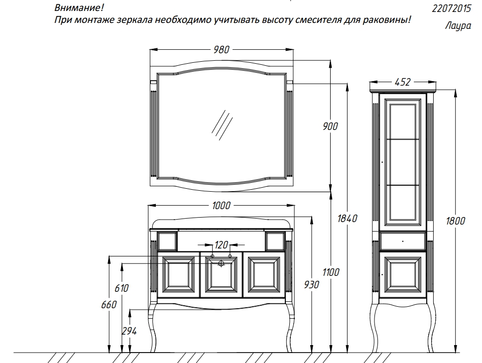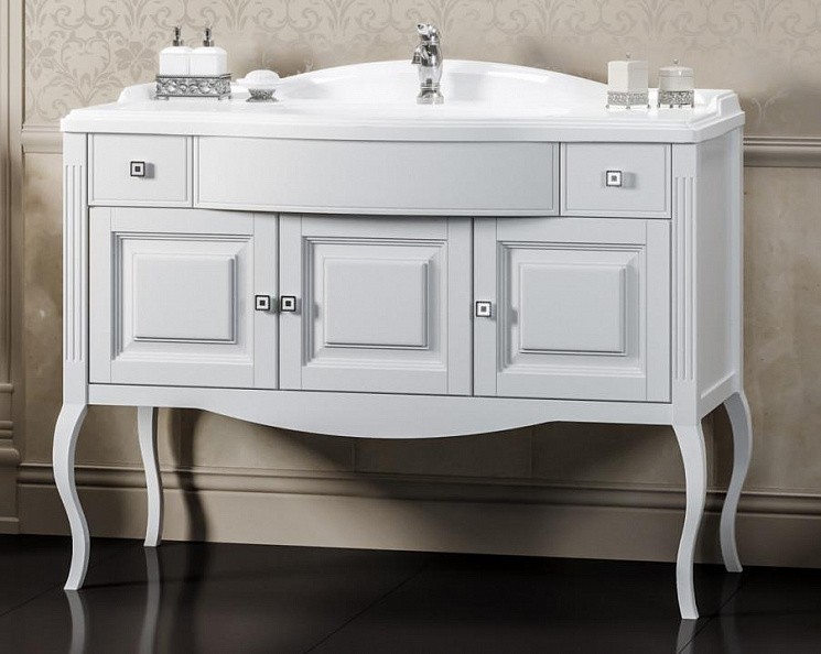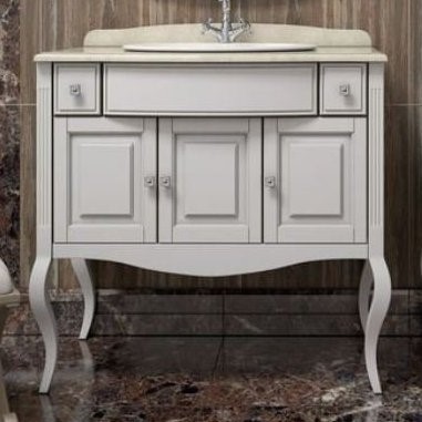 Выполнена в классическом стиле с плавными изогнутыми формами и изящными гнутыми ножками. Фасадные элементы украшены резными узорами. Особую роскошь добавляют ручки инкрустированные кристаллами Swarovski.