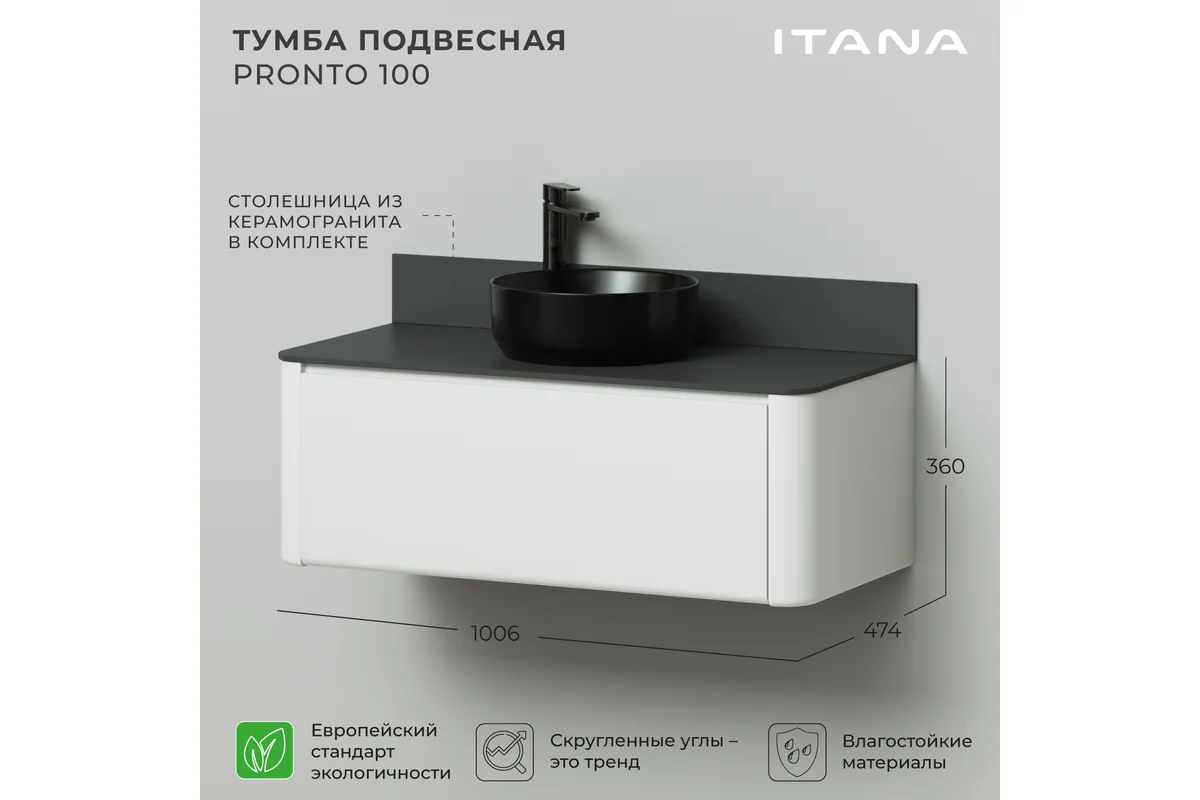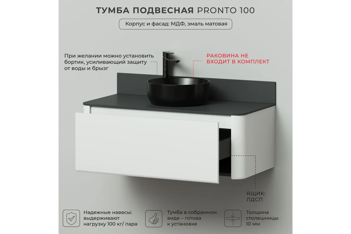 Тумба со столешницей Итана Pronto 100 - это идеальное решение для вашей ванной комнаты, объединившее в себе стиль и функциональность.